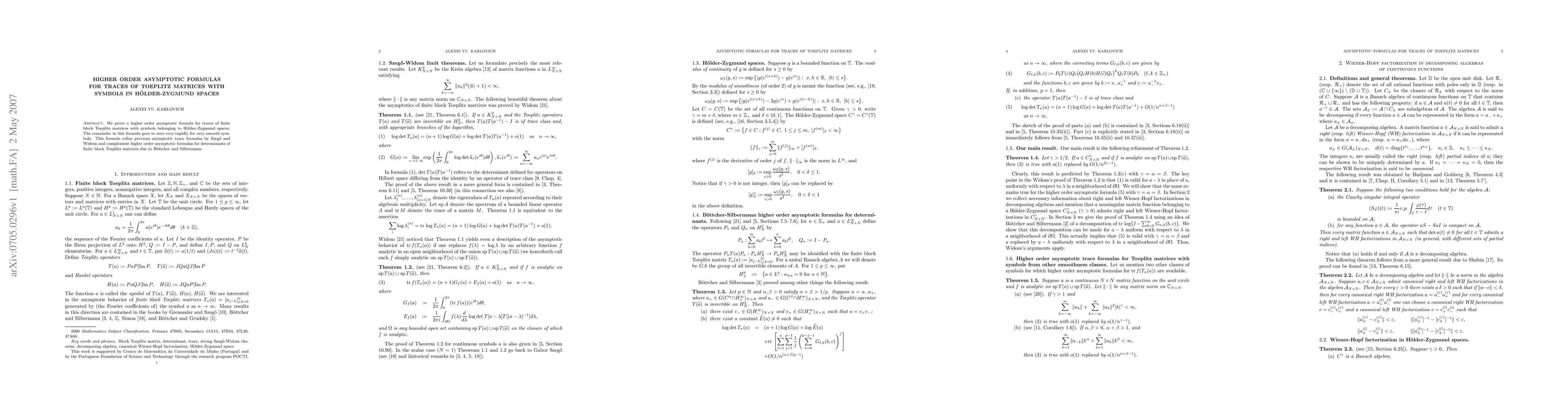 This paper establishes a higher order asymptotic formula for the traces of Toeplitz matrices with symbols in H\"older-Zygmund spaces, showing rapid convergence for smooth symbols. It refines previous results by Szeg\"o and Widom and complements existing higher order asymptotic determinant formulas for Toeplitz matrices.