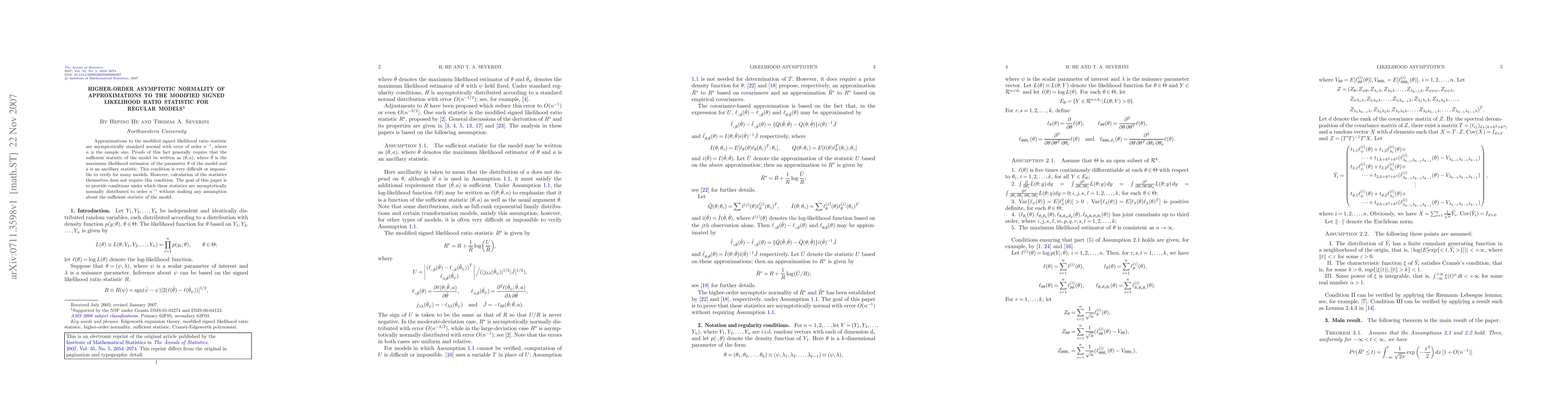 Approximations to the modified signed likelihood ratio statistic are asymptotically standard normal with error of order $n^{-1}$, where $n$ is the sample size. Proofs of this fact generally require that the sufficient statistic of the model be written as $(\hat{\theta},a)$, where $\hat{\theta}$ is the maximum likelihood estimator of the parameter $\theta$ of the model and $a$ is an ancillary statistic. This condition is very difficult or impossible to verify for many models. However, calculation of the statistics themselves does not require this condition. The goal of this paper is to provide conditions under which these statistics are asymptotically normally distributed to order $n^{-1}$ without making any assumption about the sufficient statistic of the model.