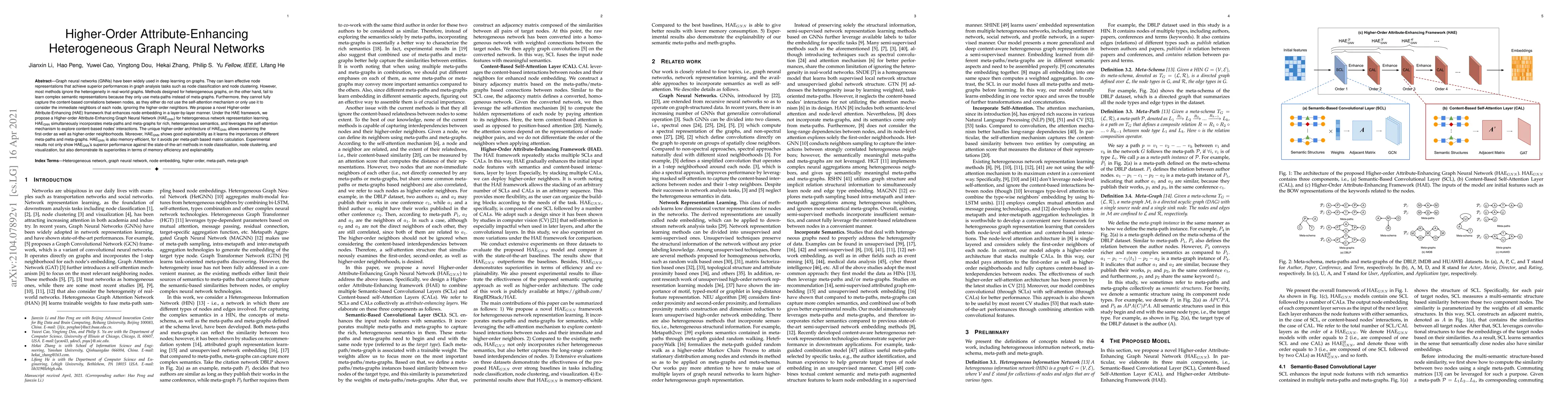 This paper proposes a Higher-order Attribute-Enhancing Graph Neural Network (HAEGNN) to address the limitations of existing heterogeneous graph neural networks. HAEGNN leverages both meta-paths and meta-graphs, and utilizes self-attention to explore higher-order node interactions, achieving superior performance in node classification, clustering, and visualization while being memory-efficient and explainable.