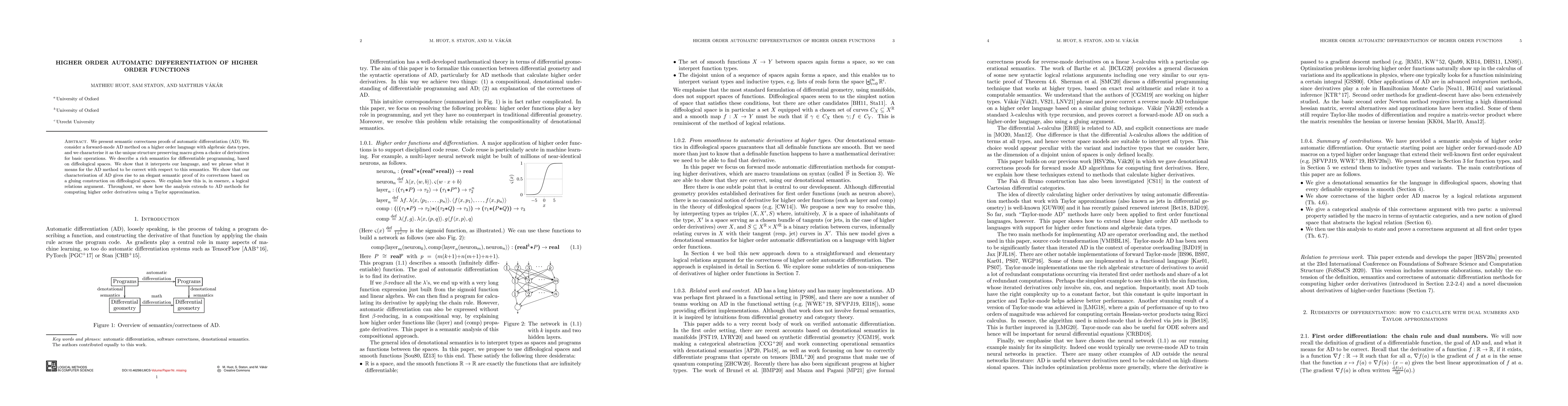 This paper presents semantic correctness proofs for a forward-mode automatic differentiation (AD) method on a higher-order language, demonstrating its correctness through a unique structure-preserving macro and a rich semantics based on diffeological spaces. It also extends the analysis to AD methods for computing higher order derivatives via Taylor approximation.