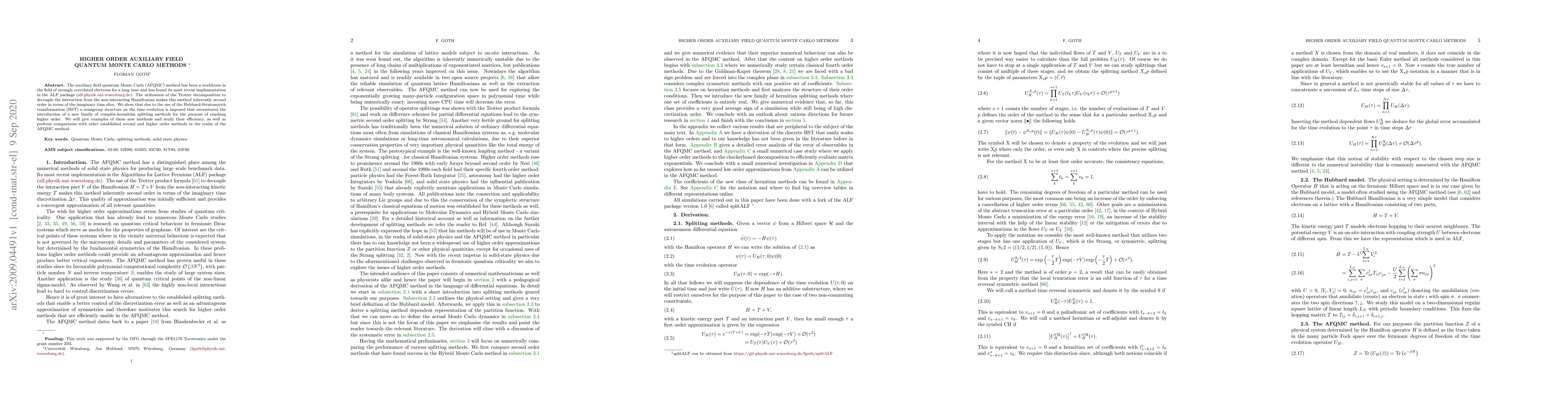 The paper introduces higher order auxiliary field quantum Monte Carlo (AFQMC) methods by employing the Hubbard-Stratonovich transformation to achieve improved accuracy, presenting new complex-hermitian splitting methods and comparing their efficiency against established second and higher order techniques.