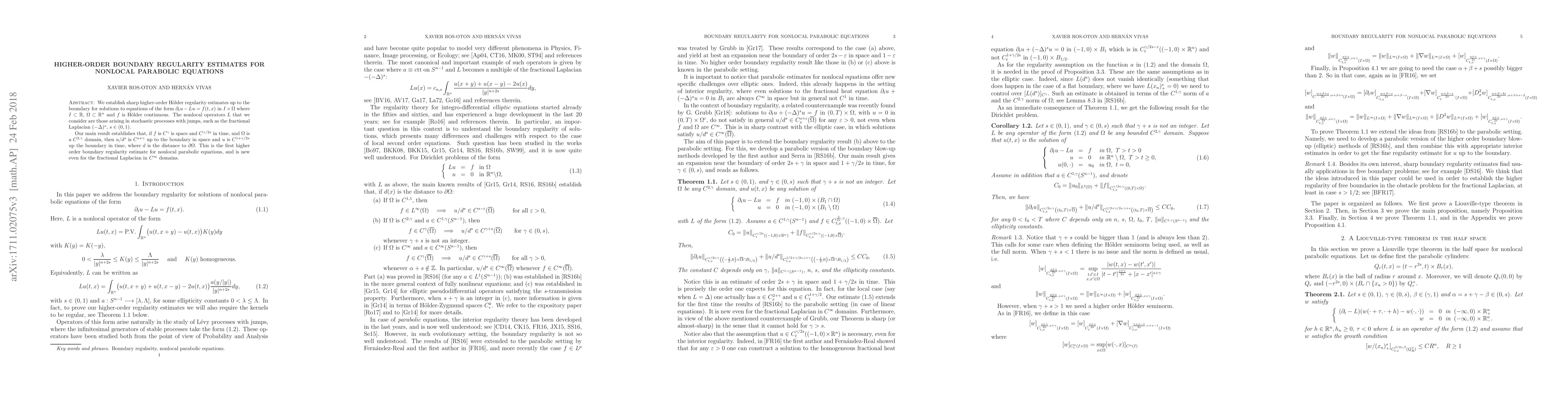 We establish sharp higher-order H\"older regularity estimates up to the boundary for solutions to equations of the form $\partial_t u-Lu=f(t,x)$ in $I\times\Omega$ where $I\subset\mathbb{R}$, $\Omega\subset\mathbb{R}^n$ and $f$ is H\"older continuous. The nonlocal operators $L$ considered are those arising in stochastic processes with jumps such as the fractional Laplacian $(-\Delta)^s$, $s\in(0,1)$. Our main result establishes that, if $f$ is $C^\gamma$ is space and $C^{\gamma/2s}$ in time, and $\Omega$ is a $C^{2,\gamma}$ domain, then $u/d^s$ is $C^{s+\gamma}$ up to the boundary in space and $u$ is $C^{1+\gamma/2s}$ up the boundary in time, where $d$ is the distance to $\partial\Omega$. This is the first higher order boundary regularity estimate for nonlocal parabolic equations, and is new even for the fractional Laplacian in $C^\infty$ domains.