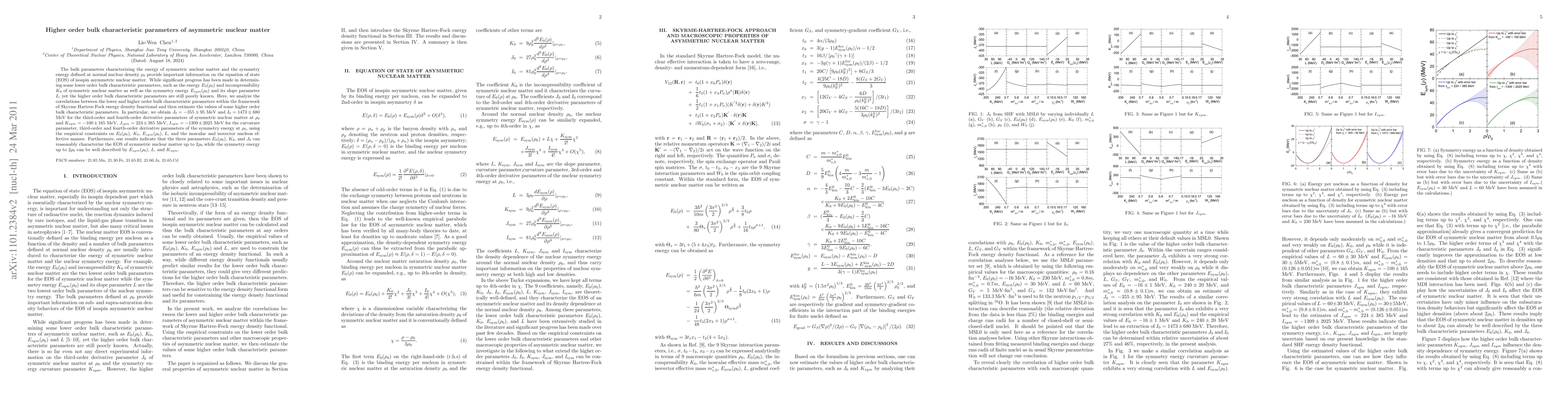 The bulk parameters characterizing the energy of symmetric nuclear matter and the symmetry energy defined at normal nuclear density $\rho_0 $ provide important information on the equation of state (EOS) of isospin asymmetric nuclear matter. While significant progress has been made in determining some lower order bulk characteristic parameters, such as the energy $E_0(\rho_0)$ and incompressibility $K_0$ of symmetric nuclear matter as well as the symmetry energy $E_{sym}(\rho_0)$ and its slope parameter $L$, yet the higher order bulk characteristic parameters are still poorly known. Here, we analyze the correlations between the lower and higher order bulk characteristic parameters within the framework of Skyrme Hartree-Fock energy density functional and then estimate the values of some higher order bulk characteristic parameters. In particular, we obtain $J_0=-355 \pm 95$ MeV and $I_0=1473 \pm 680$ MeV for the third-order and fourth-order derivative parameters of symmetric nuclear matter at $\rho_0 $ and $K_{sym} = -100 \pm 165$ MeV, $J_{sym} = 224 \pm 385$ MeV, $I_{sym} = -1309 \pm 2025$ MeV for the curvature parameter, third-order and fourth-order derivative parameters of the symmetry energy at $\rho_0 $, using the empirical constraints on $E_0(\rho_0)$, $K_0$, $E_{sym}(\rho_0)$, $L$, and the isoscalar and isovector nucleon effective masses. Furthermore, our results indicate that the three parameters $E_0(\rho_0)$, $K_0$, and $J_0$ can reasonably characterize the EOS of symmetric nuclear matter up to $2\rho_0 $ while the symmetry energy up to $2\rho_0 $ can be well described by $E_{sym}(\rho_0)$, $L$, and $K_{sym}$.