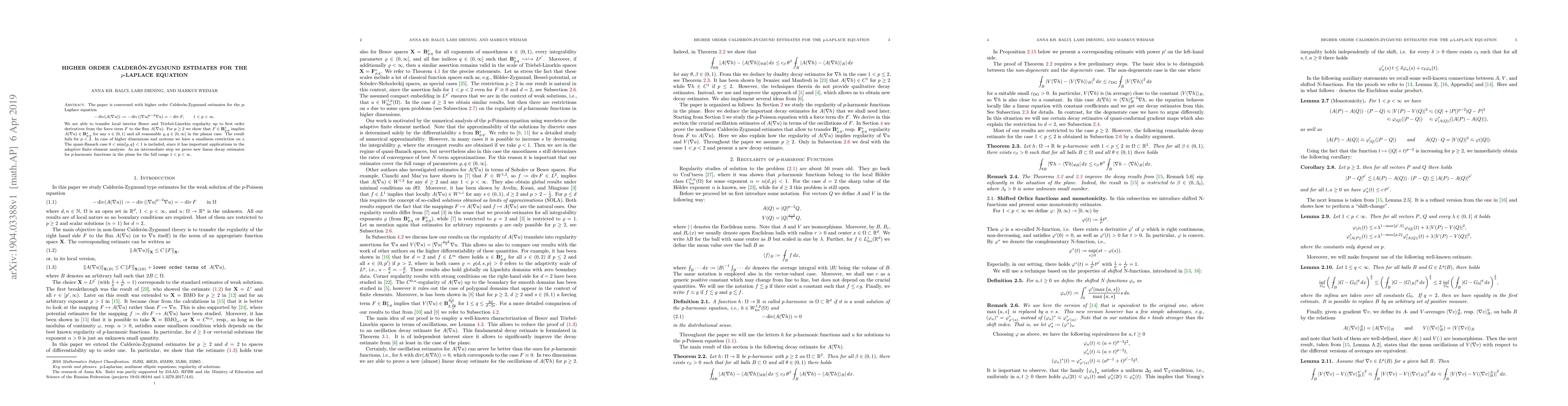 The paper is concerned with higher order Calderon-Zygmund estimates for the $p$-Laplace equation $$ -\textrm{div}(A(\nabla u)) := -\textrm{div}{(|\nabla u|^{p-2}\nabla u)}=-\textrm{div} F, \qquad 1
