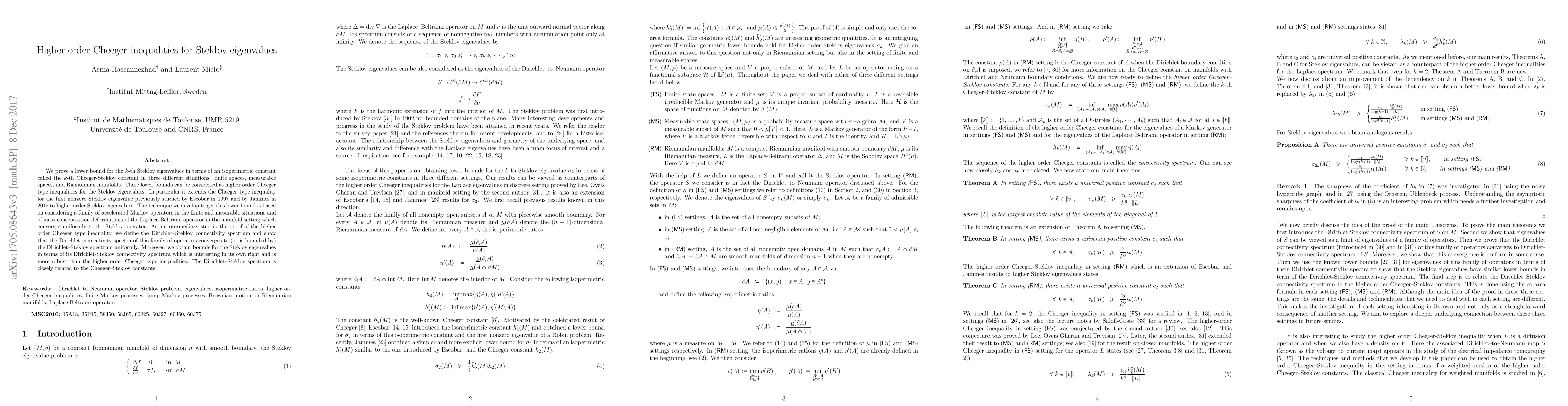 We prove a lower bound for the $k$-th Steklov eigenvalues in terms of an isoperimetric constant called the $k$-th Cheeger-Steklov constant in three different situations: finite spaces, measurable spaces, and Riemannian manifolds. These lower bounds can be considered as higher order Cheeger type inequalities for the Steklov eigenvalues. In particular it extends the Cheeger type inequality for the first nonzero Steklov eigenvalue previously studied by Escobar in 1997 and by Jammes in 2015 to higher order Steklov eigenvalues. The technique we develop to get this lower bound is based on considering a family of accelerated Markov operators in the finite and mesurable situations and of mass concentration deformations of the Laplace-Beltrami operator in the manifold setting which converges uniformly to the Steklov operator. As an intermediary step in the proof of the higher order Cheeger type inequality, we define the Dirichlet-Steklov connectivity spectrum and show that the Dirichlet connectivity spectra of this family of operators converges to (or bounded by) the Dirichlet-Steklov spectrum uniformly. Moreover, we obtain bounds for the Steklov eigenvalues in terms of its Dirichlet-Steklov connectivity spectrum which is interesting in its own right and is more robust than the higher order Cheeger type inequalities. The Dirichlet-Steklov spectrum is closely related to the Cheeger-Steklov constants.