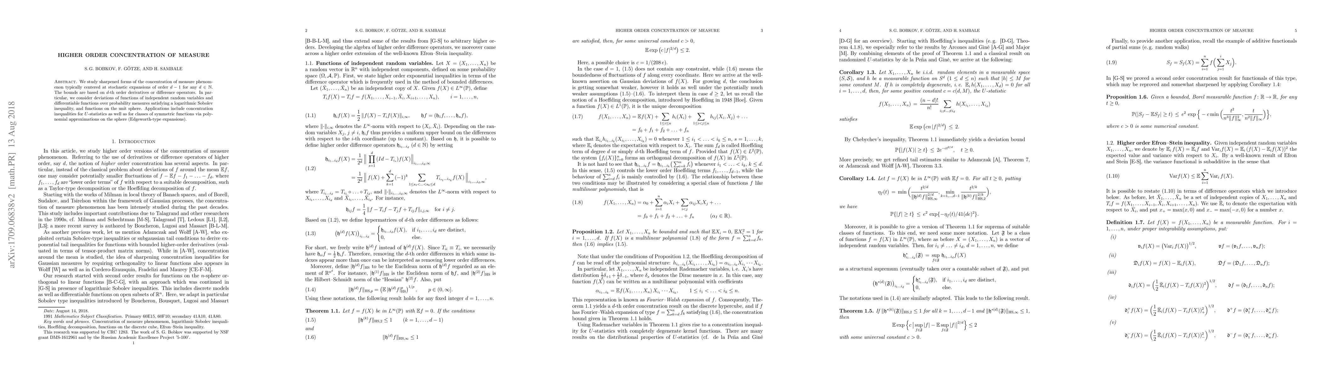 This paper investigates enhanced concentration of measure phenomena using $d$-th order derivatives, focusing on stochastic expansions and deviations of functions over probability measures. It applies these findings to concentration inequalities for $U$-statistics and symmetric functions via polynomial approximations on the unit sphere.