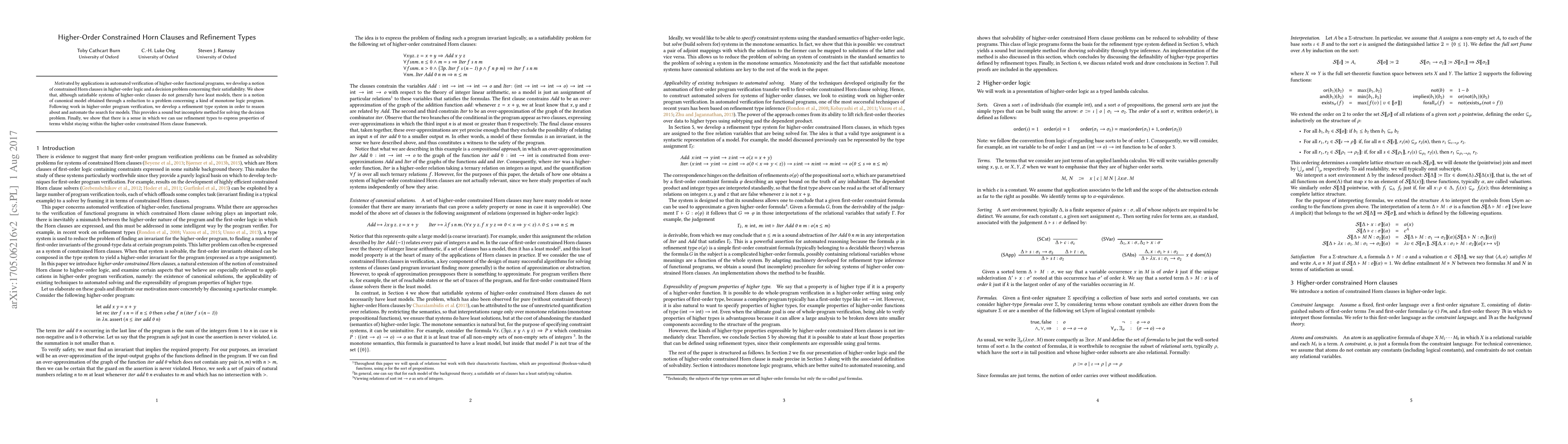 Motivated by applications in automated verification of higher-order functional programs, we develop a notion of constrained Horn clauses in higher-order logic and a decision problem concerning their satisfiability. We show that, although satisfiable systems of higher-order clauses do not generally have least models, there is a notion of canonical model obtained through a reduction to a problem concerning a kind of monotone logic program. Following work in higher-order program verification, we develop a refinement type system in order to reason about and automate the search for models. This provides a sound but incomplete method for solving the decision problem. Finally, we show that an extension of the decision problem in which refinement types are used directly as guards on existential quantifiers can be reduced to the original problem. This result can be used to show that properties of higher-order functions that are definable using refinement types are also expressible using higher-order constrained Horn clauses.