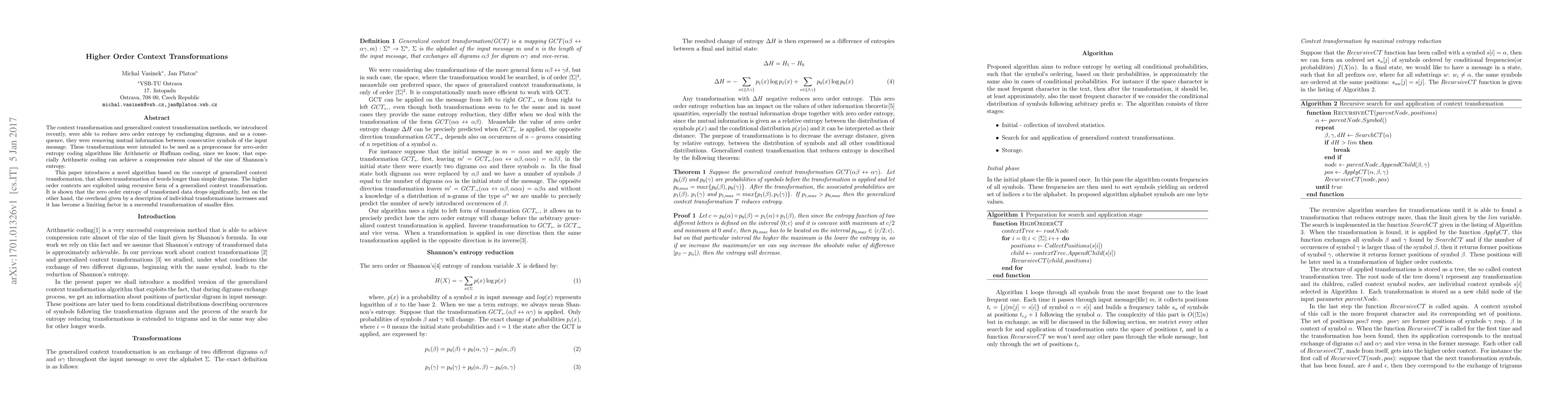 The context transformation and generalized context transformation methods, we introduced recently, were able to reduce zero order entropy by exchanging digrams, and as a consequence, they were removing mutual information between consecutive symbols of the input message. These transformations were intended to be used as a preprocessor for zero-order entropy coding algorithms like Arithmetic or Huffman coding, since we know, that especially Arithmetic coding can achieve a compression rate almost of the size of Shannon's entropy. This paper introduces a novel algorithm based on the concept of generalized context transformation, that allows transformation of words longer than simple digrams. The higher order contexts are exploited using recursive form of a generalized context transformation. It is shown that the zero order entropy of transformed data drops significantly, but on the other hand, the overhead given by a description of individual transformations increases and it has become a limiting factor in a successful transformation of smaller files.