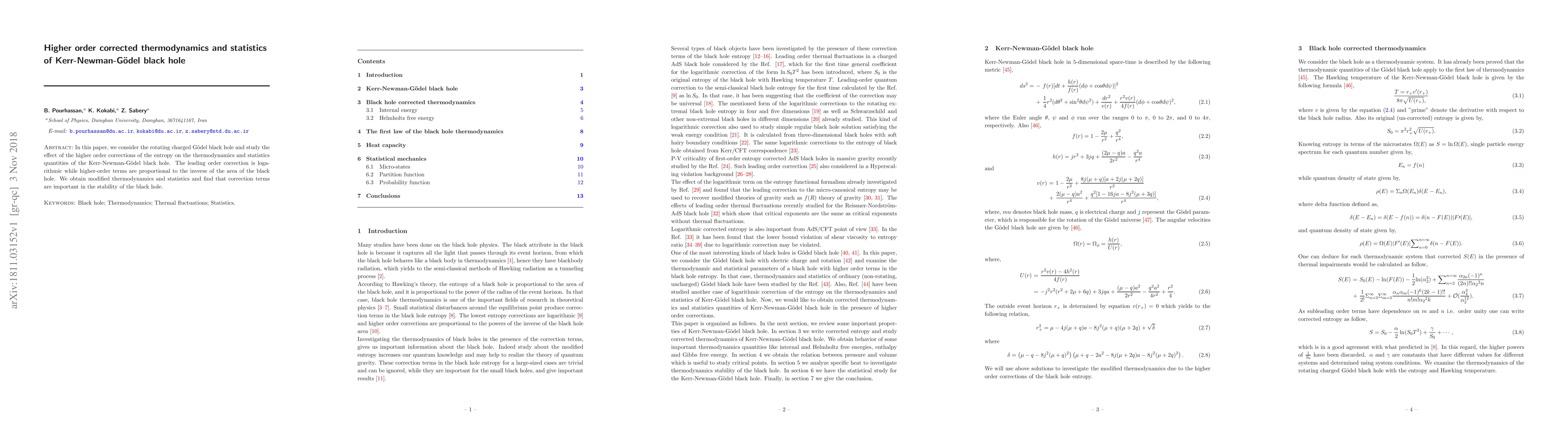 This paper investigates the thermodynamics and statistical properties of the Kerr-Newman-Godel black hole, focusing on higher order corrections to entropy. The study reveals significant modifications to thermodynamics and statistics, with logarithmic leading order corrections and inverse area higher-order terms, highlighting their importance for black hole stability.