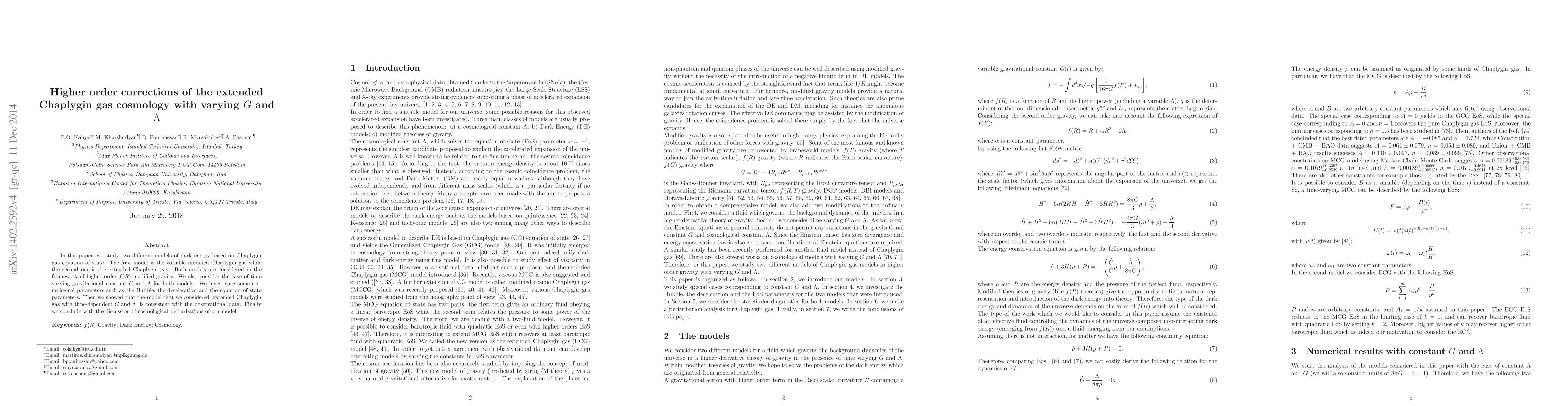 In this paper, we study two different models of dark energy based on Chaplygin gas equation of state. The first model is the variable modified Chaplygin gas while the second one is the extended Chaplygin gas. Both models are considered in the framework of higher order $f(R)$ modified gravity. We also consider the case of time varying gravitational constant $G$ and $\Lambda$ for both models. We investigate some cosmological parameters such as the Hubble, the deceleration and the equation of state parameters. Then we showed that the model that we considered, extended Chaplygin gas with time-dependent $G$ and $\Lambda$, is consistent with the observational data. Finally we conclude with the discussion of cosmological perturbations of our model.