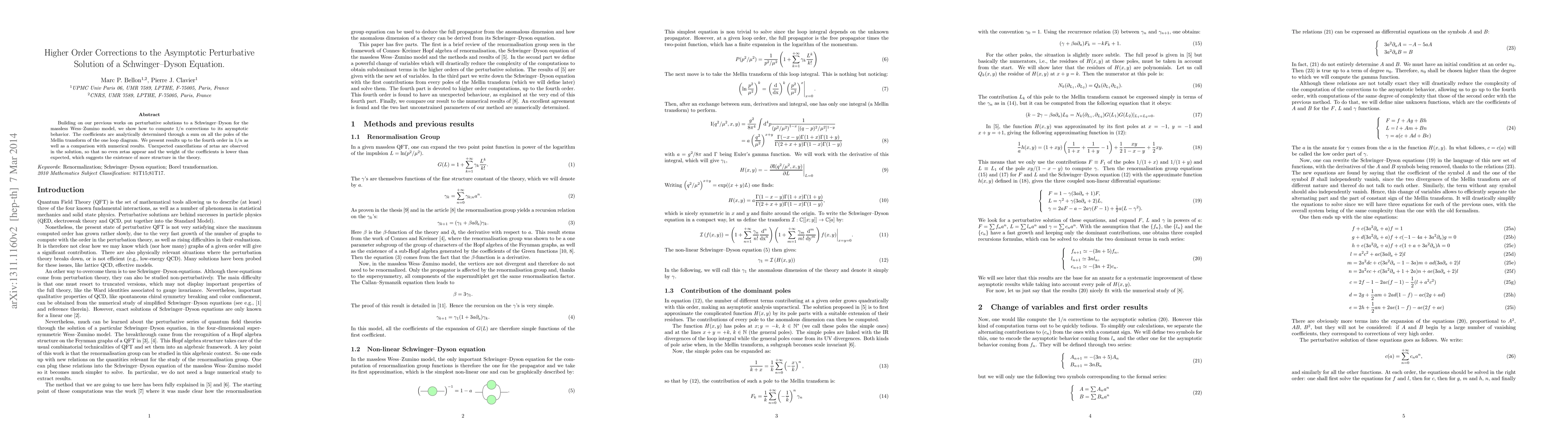 Building on our previous works on perturbative solutions to a Schwinger-Dyson for the massless Wess-Zumino model, we show how to compute 1/n corrections to its asymptotic behavior. The coefficients are analytically determined through a sum on all the poles of the Mellin transform of the one loop diagram. We present results up to the fourth order in 1/n as well as a comparison with numerical results. Unexpected cancellations of zetas are observed in the solution, so that no even zetas appear and the weight of the coefficients is lower than expected, which suggests the existence of more structure in the theory.
