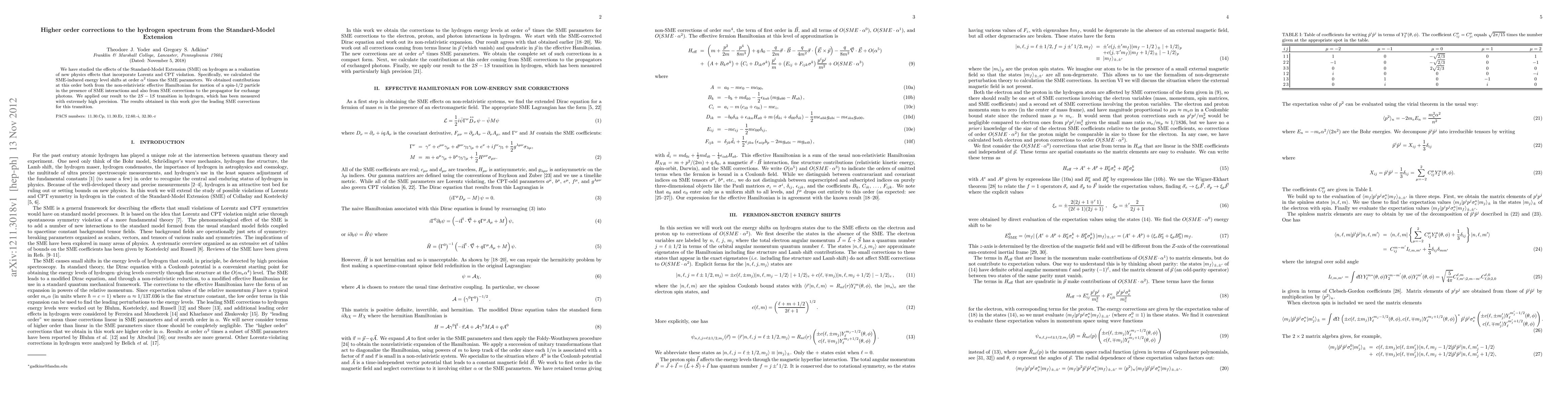 We have studied the effects of the Standard-Model Extension (SME) on hydrogen as a realization of new physics effects that incorporate Lorentz and CPT violation. Specifically, we calculated the SME-induced energy level shifts at order $\alpha^2$ times the SME parameters. We obtained contributions at this order both from the non-relativistic effective Hamiltonian for motion of a spin-1/2 particle in the presence of SME interactions and also from SME corrections to the propagator for exchange photons. We applied our result to the $2S-1S$ transition in hydrogen, which has been measured with extremely high precision. The results obtained in this work give the leading SME corrections for this transition.