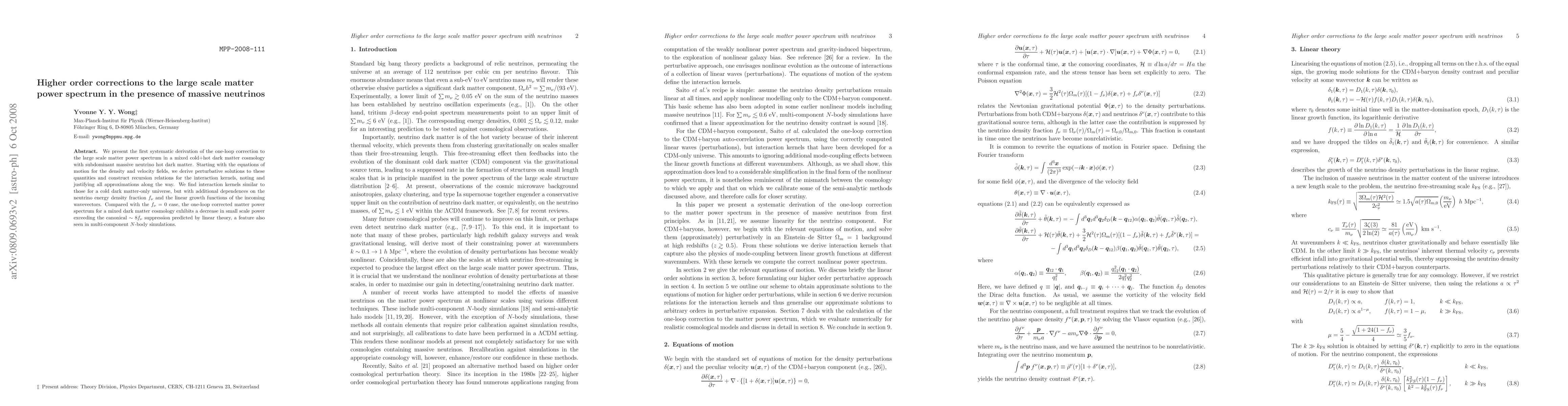 We present the first systematic derivation of the one-loop correction to the large scale matter power spectrum in a mixed cold+hot dark matter cosmology with subdominant massive neutrino hot dark matter. Starting with the equations of motion for the density and velocity fields, we derive perturbative solutions to these quantities and construct recursion relations for the interaction kernels, noting and justifying all approximations along the way. We find interaction kernels similar to those for a cold dark matter-only universe, but with additional dependences on the neutrino energy density fraction f_nu and the linear growth functions of the incoming wavevectors. Compared with the f_nu=0 case, the one-loop corrected matter power spectrum for a mixed dark matter cosmology exhibits a decrease in small scale power exceeding the canonical ~8 f_nu suppression predicted by linear theory, a feature also seen in multi-component N-body simulations.