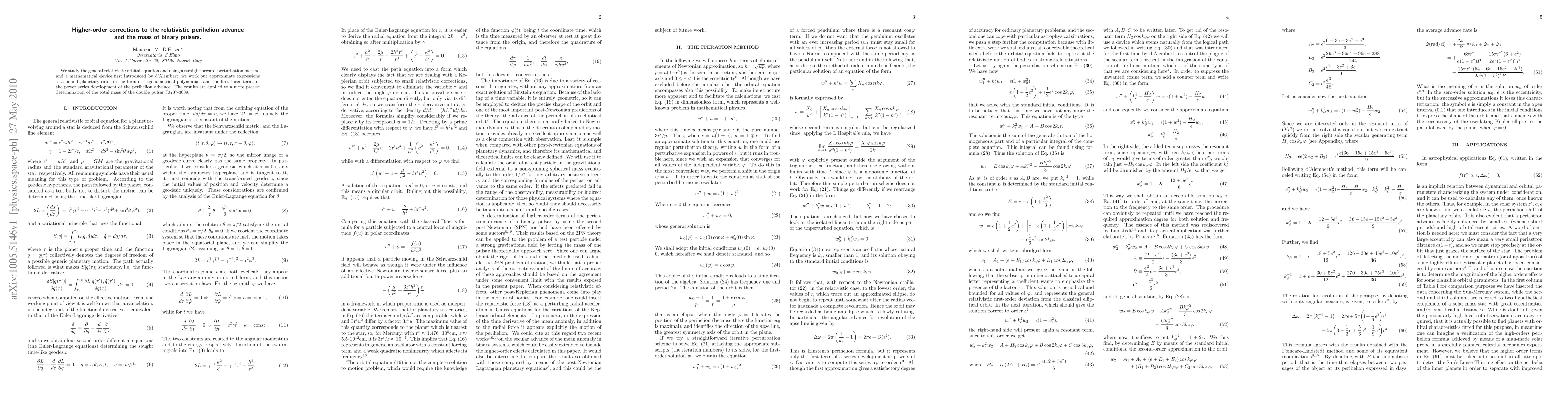 We study the general relativistic orbital equation and using a straightforward perturbation method and a mathematical device first introduced by d'Alembert, we work out approximate expressions of a bound planetary orbit in the form of trigonometrical polynomials and the first three terms of the power series development of the perihelion advance. The results are applied to a more precise determination of the total mass of the double pulsar J0737-3039.