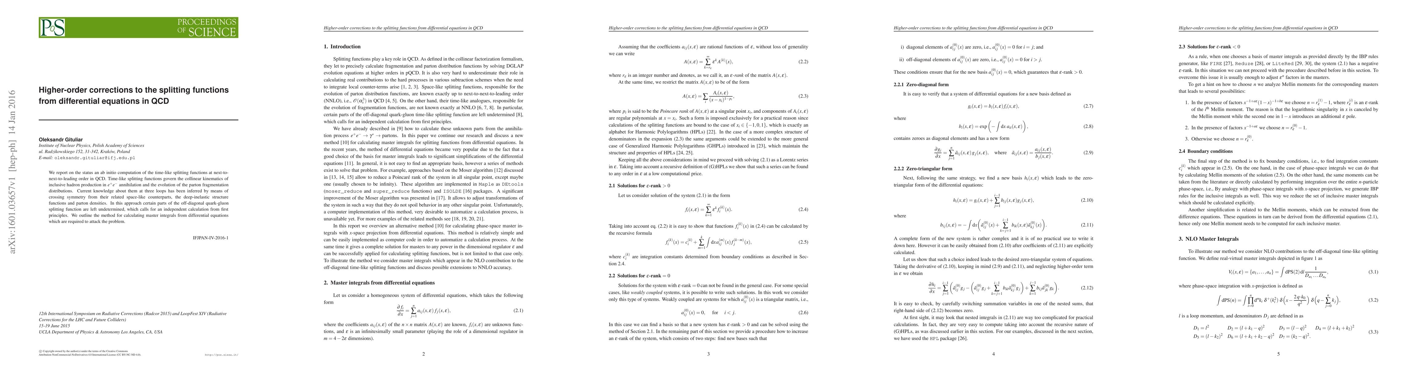 We report on the status an ab initio computation of the time-like splitting functions at next-to-next-to-leading order in QCD. Time-like splitting functions govern the collinear kinematics of inclusive hadron production in $e^+e^-$ annihilation and the evolution of the parton fragmentation distributions. Current knowledge about them at three loops has been inferred by means of crossing symmetry from their related space-like counterparts, the deep-inelastic structure functions and parton densities. In this approach certain parts of the off-diagonal quark-gluon splitting function are left undetermined, which calls for an independent calculation from first principles. We outline the method for calculating master integrals from differential equations which are required to attack the problem.