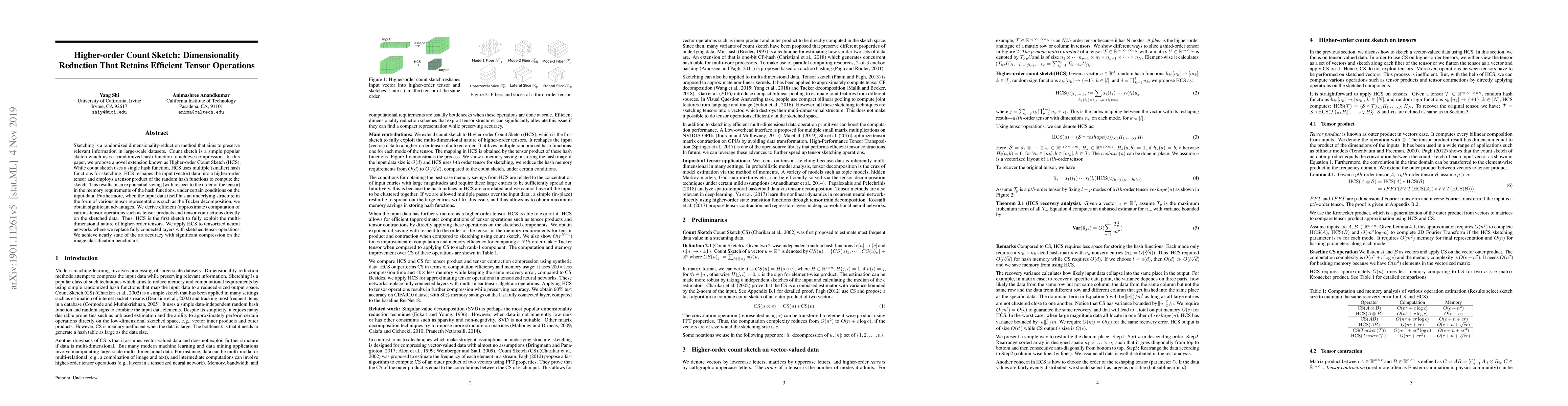 Sketching is a randomized dimensionality-reduction method that aims to preserve relevant information in large-scale datasets. Count sketch is a simple popular sketch which uses a randomized hash function to achieve compression. In this paper, we propose a novel extension known as Higher-order Count Sketch (HCS). While count sketch uses a single hash function, HCS uses multiple (smaller) hash functions for sketching. HCS reshapes the input (vector) data into a higher-order tensor and employs a tensor product of the random hash functions to compute the sketch. This results in an exponential saving (with respect to the order of the tensor) in the memory requirements of the hash functions, under certain conditions on the input data. Furthermore, when the input data itself has an underlying structure in the form of various tensor representations such as the Tucker decomposition, we obtain significant advantages. We derive efficient (approximate) computation of various tensor operations such as tensor products and tensor contractions directly on the sketched data. Thus, HCS is the first sketch to fully exploit the multi-dimensional nature of higher-order tensors. We apply HCS to tensorized neural networks where we replace fully connected layers with sketched tensor operations. We achieve nearly state of the art accuracy with significant compression on the image classification benchmark.