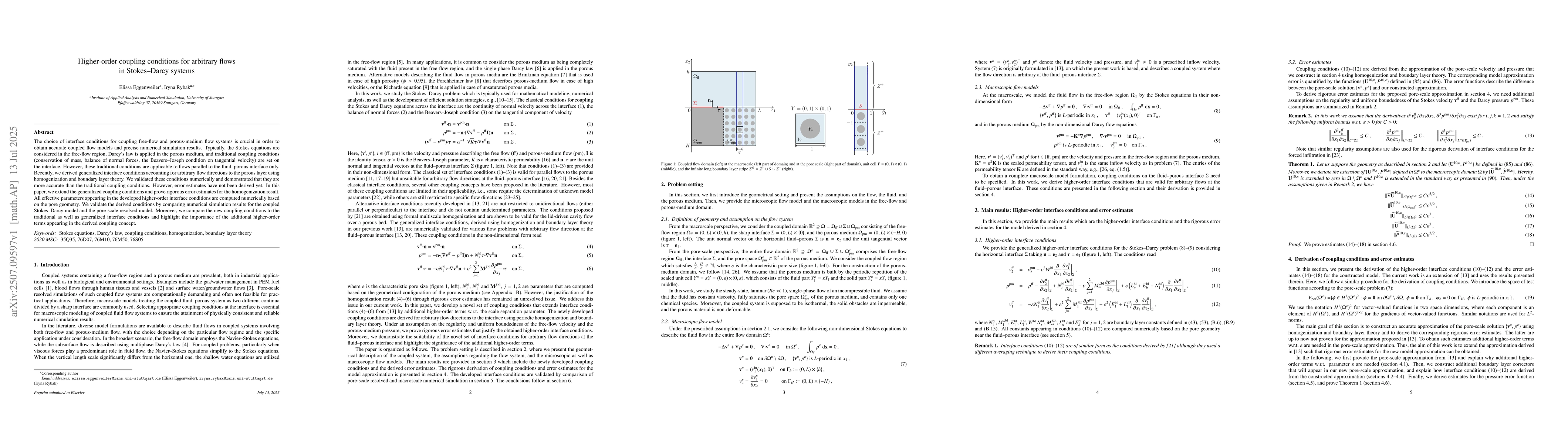 The choice of interface conditions for coupling free-flow and porous-medium flow systems is crucial in order to obtain accurate coupled flow models and precise numerical simulation results. Typically, the Stokes equations are considered in the free-flow region, Darcy's law is applied in the porous medium, and traditional coupling conditions (conservation of mass, balance of normal forces, the Beavers-Joseph condition on tangential velocity) are set on the interface. However, these traditional conditions are applicable to flows parallel to the fluid-porous interface only. Recently, we derived generalized interface conditions accounting for arbitrary flow directions to the porous layer using homogenization and boundary layer theory. We validated these conditions numerically and demonstrated that they are more accurate than the traditional coupling conditions. However, error estimates have not been derived yet. In this paper, we extend the generalized coupling conditions and prove rigorous error estimates for the homogenization result. All effective parameters appearing in the developed higher-order interface conditions are computed numerically based on the pore geometry. We validate the derived conditions by comparing numerical simulation results for the coupled Stokes-Darcy model and the pore-scale resolved model. Moreover, we compare the new coupling conditions to the traditional as well as generalized interface conditions and highlight the importance of the additional higher-order terms appearing in the derived coupling concept.