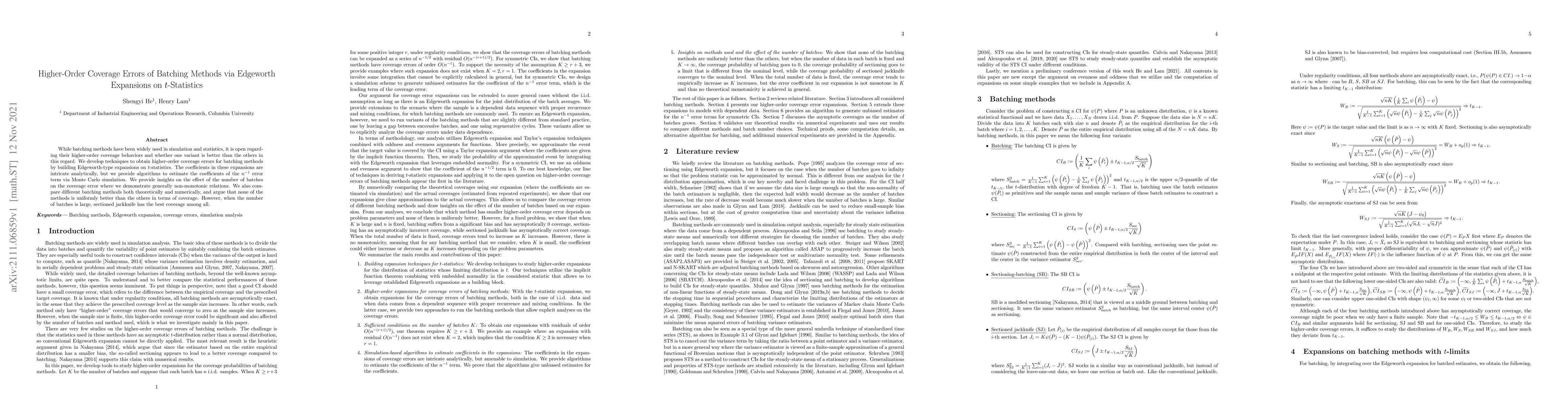 Researchers developed techniques to analyze higher-order coverage errors of batching methods using Edgeworth expansions on t-statistics, revealing non-monotonic relations between batch size and error rate and that no method is uniformly better than others.