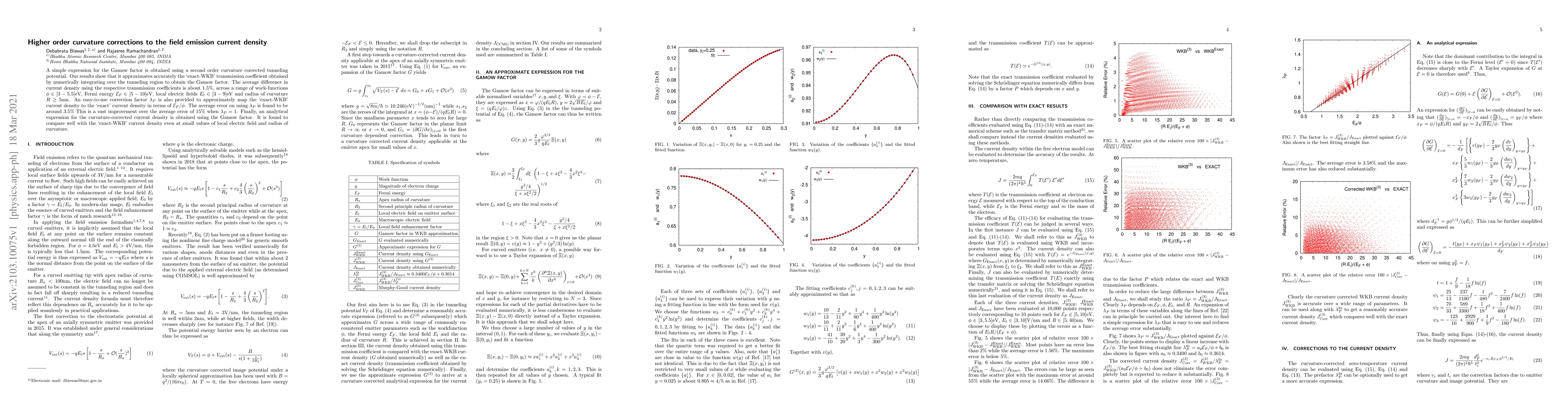 A simple expression for the Gamow factor is obtained using a second order curvature corrected tunneling potential. Our results show that it approximates accurately the `exact-WKB' transmission coefficient obtained by numerically integrating over the tunneling region to obtain the Gamow factor. The average difference in current density using the respective transmission coefficients is about $1.5 \%$, across a range of work-functions $\phi \in [3-5.5]$eV, Fermi energy ${\cal{E}}_F$ in [5-10]eV, local electric fields $E_l$ in[3-9]eV and radius of curvature $R \geq 5$nm). An easy-to-use correction factor $\lambda_P$ is also provided to approximately map the `exact-WKB' current density to the `exact' current density in terms of ${\cal{E}}_F/\phi$. The average error on using $\lambda_P$ is found to be around $3.5\%$. This is a vast improvement over the average error of $15\%$ when $\lambda_P = 1$. Finally, an analytical expression for the curvature-corrected current density is obtained using the Gamow factor. It is found to compare well with the `exact-WKB' current density even at small values of local electric field and radius of curvature.