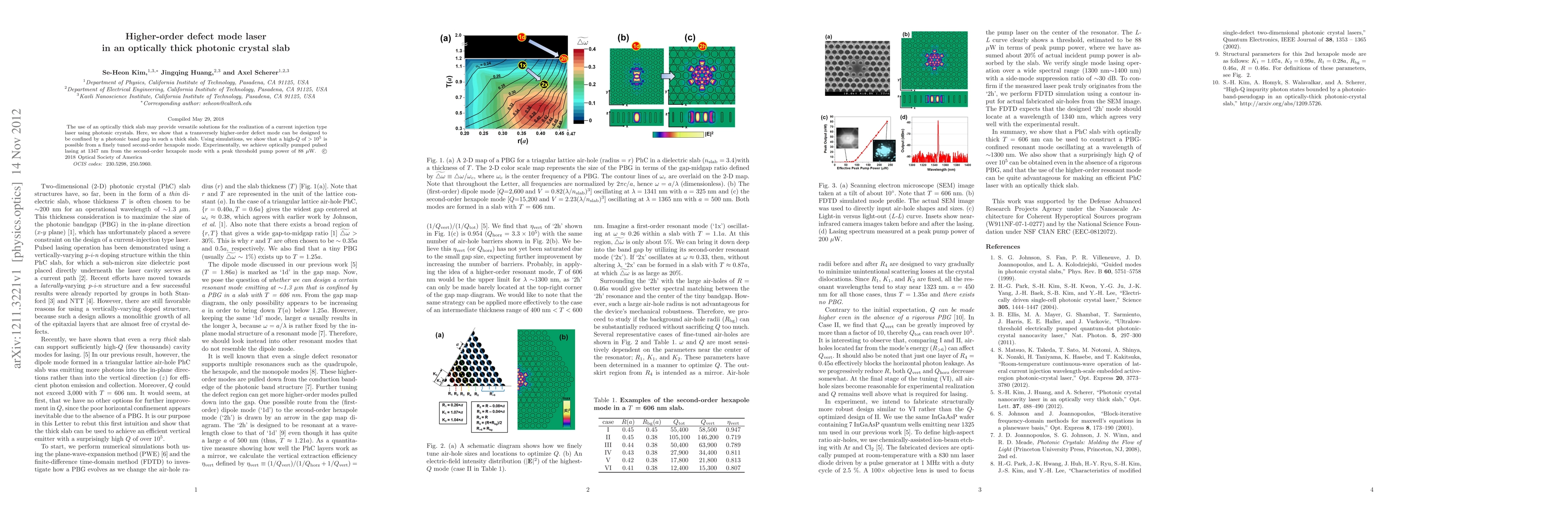 Summary: This research demonstrates a current injection type laser utilizing a photonic crystal in an optically thick slab, achieving a high-Q factor of 10^5 from a second-order hexapole mode, and experimentally verifying optically pumped pulsed lasing at 1347 nm with a threshold pump power of 88 µW.