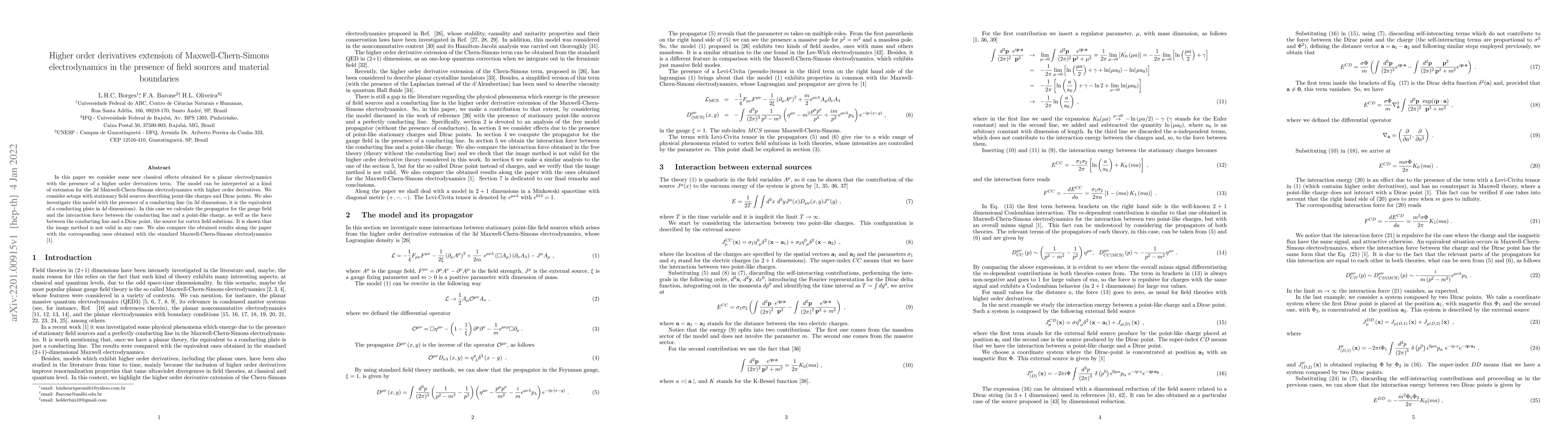 In this paper we consider some new classical effects obtained for a planar electrodynamics with the presence of a higher order derivatives term. The model can be interpreted as a kind of extension for the $3d$ Maxwell-Chern-Simons electrodynamics with higher order derivatives. We consider setups with stationary field sources describing point-like charges and Dirac points. We also investigate this model with the presence of a conducting line (in $3d$ dimensions, it is the equivalent of a conducting plate in $4d$ dimensions). In this case we calculate the propagator for the gauge field and the interaction force between the conducting line and a point-like charge, as well as the force between the conducting line and a Dirac point, the source for vortex field solutions. It is shown that the image method is not valid in any case. We also compare the obtained results along the paper with the corresponding ones obtained with the standard Maxwell-Chern-Simons electrodynamics [1].