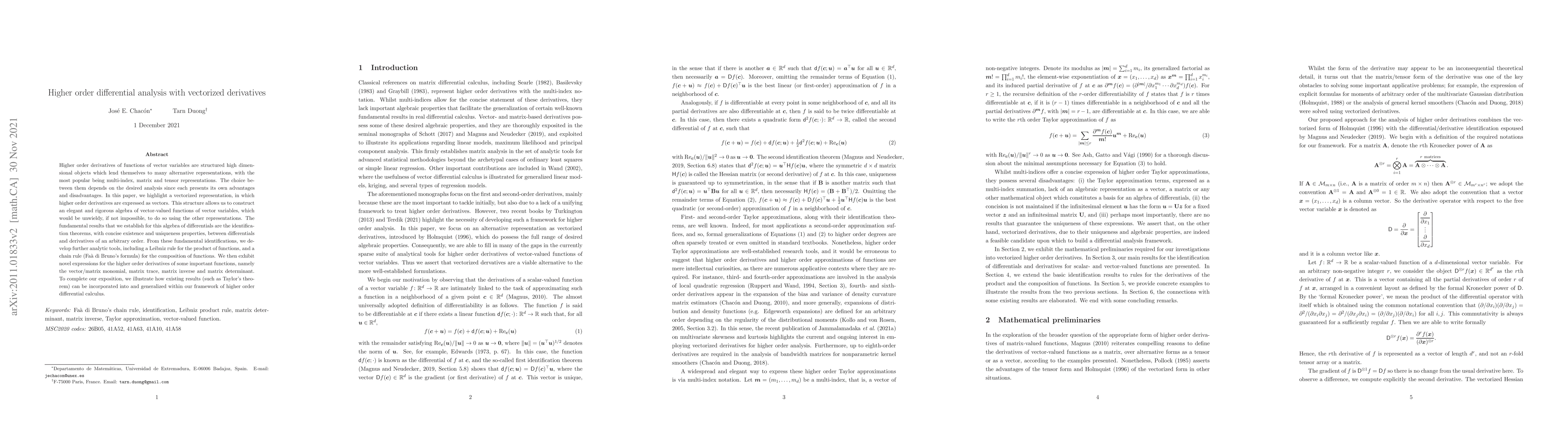 This paper explores a vectorized representation for higher order derivatives, establishing an elegant algebra of vector-valued functions. It develops fundamental identification theorems and analytic tools like a Leibniz rule and Faà di Bruno's formula, while generalizing existing methods such as Taylor's theorem within this new framework.