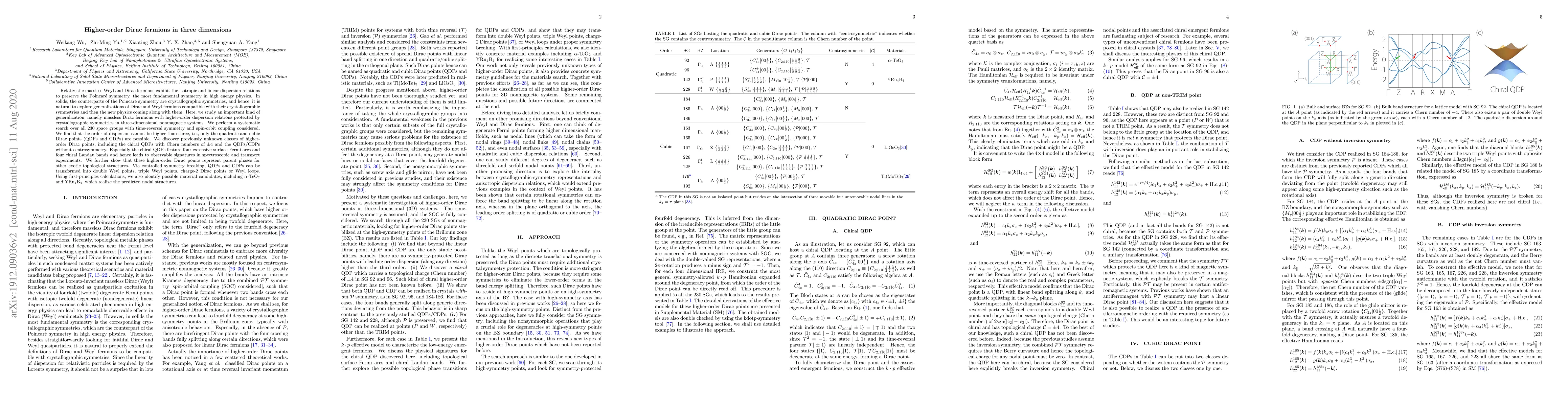 This paper explores higher-order dispersion relations for massless Dirac fermions in 3D nonmagnetic solids, finding that only quadratic and cubic Dirac points are feasible. Novel chiral quadratic Dirac points with unique Fermi arcs and Landau bands are discovered, offering potential material realizations in $\alpha$-TeO$_2$ and YRu$_4$B$_4$.