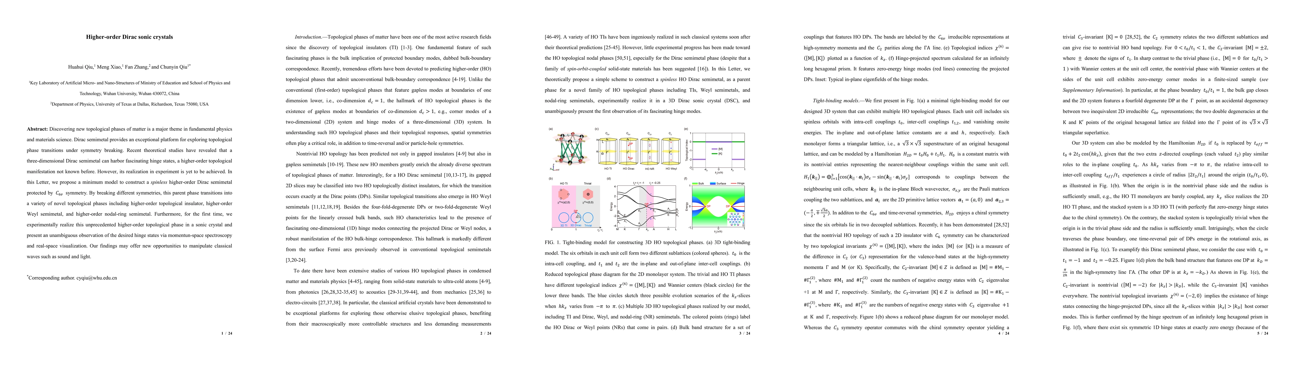 This paper proposes a theoretical model for a spinless higher-order Dirac semimetal protected by C_6v symmetry and experimentally realizes it in a sonic crystal. The model transitions into various novel topological phases upon symmetry breaking, and the experimental realization confirms the presence of hinge states.