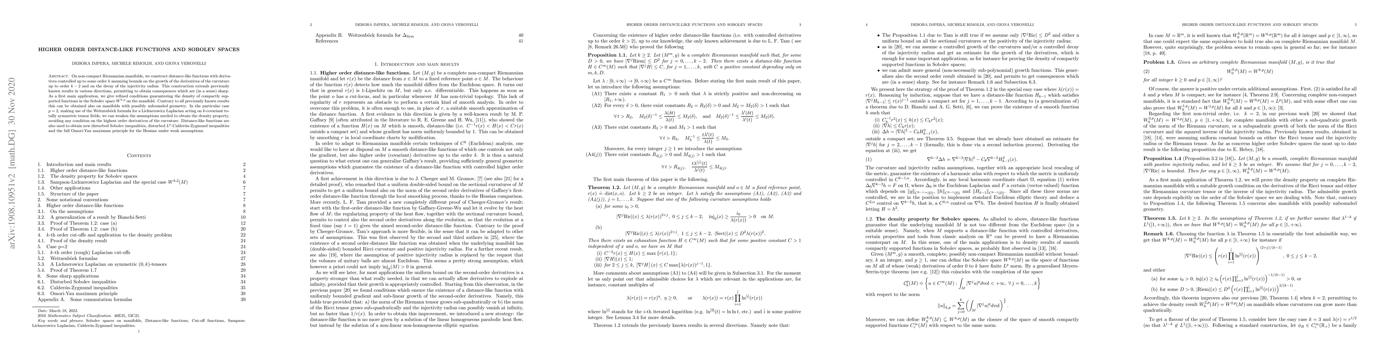 We consider complete Riemannian manifolds with a controlled growth of the covariant derivatives of Ricci curvatures up to order $k-2$ and a controlled decay of the injectivity radii. On such manifolds we construct distance-like functions with a control on covariant derivatives up to order $k$. Alternatively, the assumption on the injectivity radii can be replaced with the request of a controlled growth of the full curvature tensor at order $0$. The control in the assumptions occur via non-necessarily polynomial growth functions. This construction largely extend previously known results in various directions, permitting to obtain consequences which are (in a sense) sharp. A first main application is to the study of the density property for Sobolev spaces on Riemannian manifolds, namely the problem of guaranteeing the density of smooth compactly supported function in the Sobolev space $W^{k,p}$. Contrary to all previously known results this can be obtained also on manifolds with possibly unbounded geometry. In the particular case $p=2$, making use of the Weitzenb\"ock formula for a Lichnerowicz Laplacian acting on the space of smooth section of the bundle of $k$-covariant symmetric tensors, we can weaken the assumptions needed to obtain the density property. Namely we prove that the control on the highest order derivative of curvature is not needed in this situation. Beyond the density property we finally highlight some new applications of our results to disturbed Sobolev inequalities, disturbed $L^{p}$-Calder\'on-Zygmund inequalities and the full Omori-Yau maximum principle for the Hessian.
