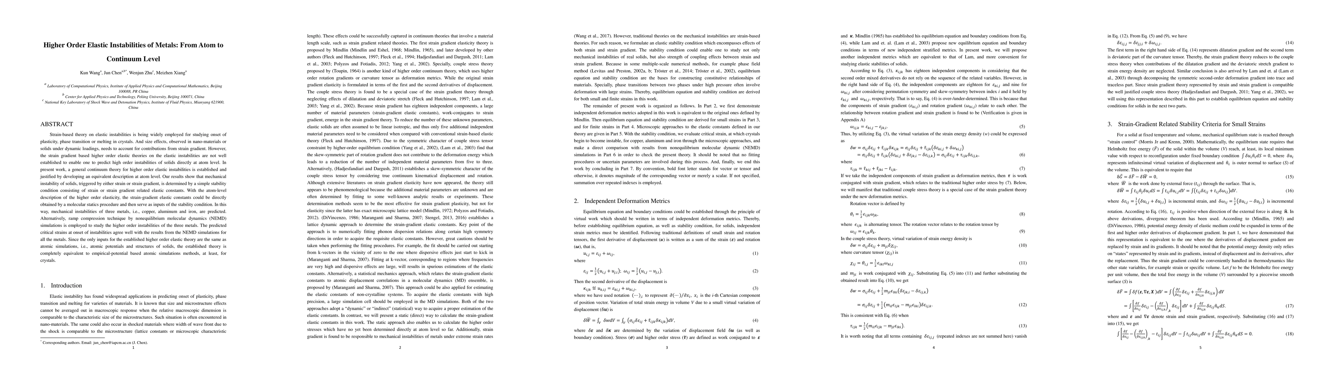 Strain-based theory on elastic instabilities is being widely employed for studying onset of plasticity, phase transition or melting in crystals. And size effects, observed in nano-materials or solids under dynamic loadings, needs to account for contributions from strain gradient. However, the strain gradient based higher order elastic theories on the elastic instabilities are not well established to enable one to predict high order instabilities of solids directly at atom level. In present work, a general continuum theory for higher order elastic instabilities is established and justified by developing an equivalent description at atom level. Our results show that mechanical instability of solids, triggered by either strain or strain gradient, is determined by a simple stability condition consisting of strain or strain gradient related elastic constants. With the atom-level description of the higher order elasticity, the strain-gradient elastic constants could be directly obtained by a molecular statics procedure and then serve as inputs of the stability condition. In this way, mechanical instabilities of three metals, i.e., copper, aluminum and iron, are predicted. Alternatively, ramp compression technique by nonequilibrium molecular dynamics (NEMD) simulations is employed to study the higher order instabilities of the three metals. The predicted critical strains at onset of instabilities agree well with the results from the NEMD simulations for all the metals. Since the only inputs for the established higher order elastic theory are the same as atomic simulations, i.e., atomic potentials and structures of solids, the established theory is completely equivalent to empirical-potential based atomic simulations methods, at least, for crystals.