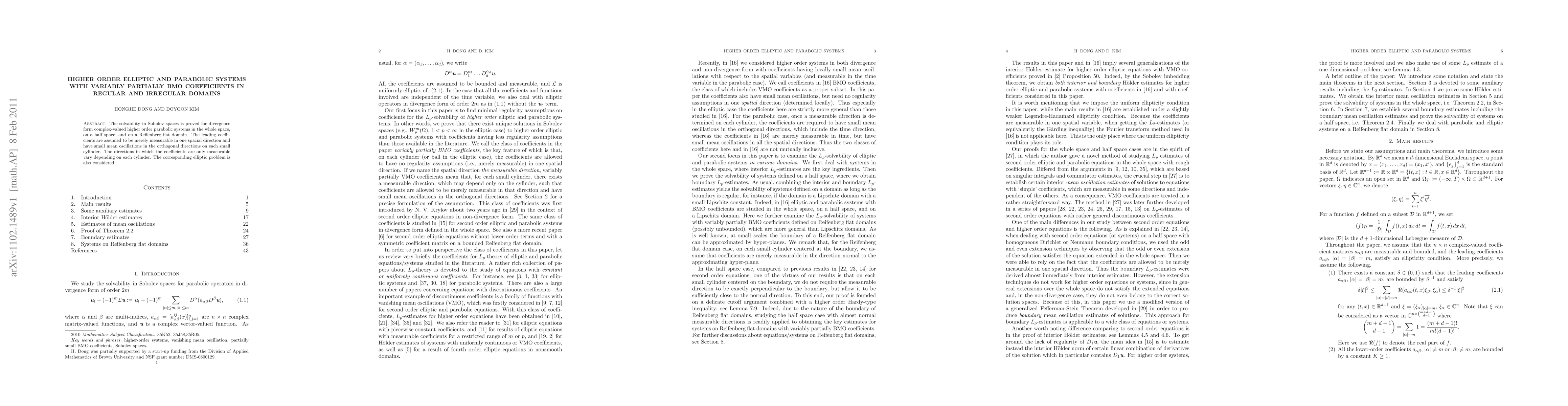 The solvability in Sobolev spaces is proved for divergence form complex-valued higher order parabolic systems in the whole space, on a half space, and on a Reifenberg flat domain. The leading coefficients are assumed to be merely measurable in one spacial direction and have small mean oscillations in the orthogonal directions on each small cylinder. The directions in which the coefficients are only measurable vary depending on each cylinder. The corresponding elliptic problem is also considered.