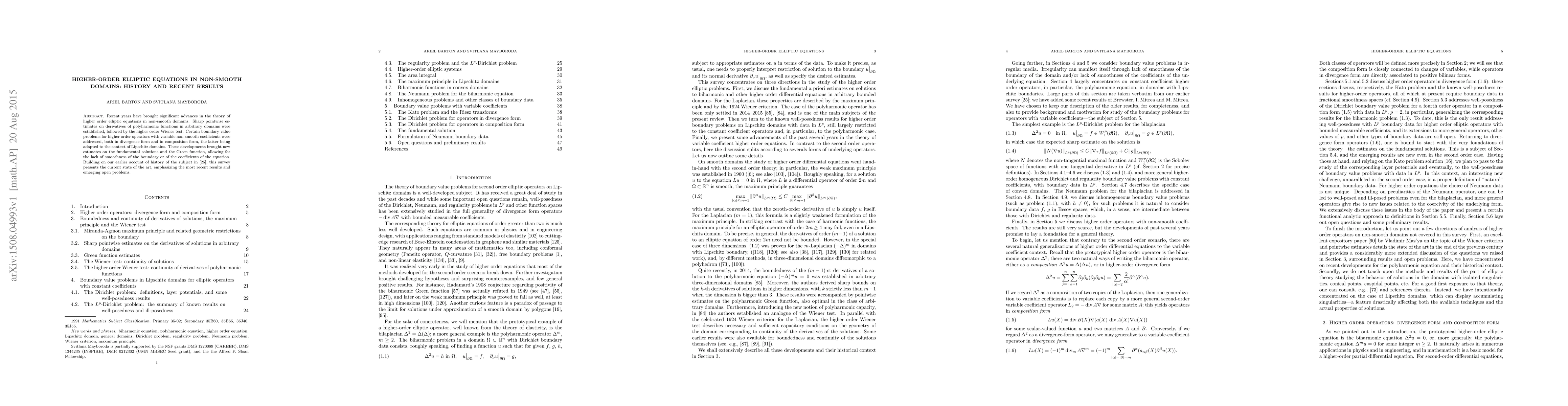 This paper surveys recent advances in the theory of higher-order elliptic equations in non-smooth domains, highlighting sharp pointwise estimates and the higher order Wiener test. It addresses boundary value problems for higher-order operators with variable coefficients, presenting new estimates on fundamental solutions and Green functions despite domain or coefficient non-smoothness.