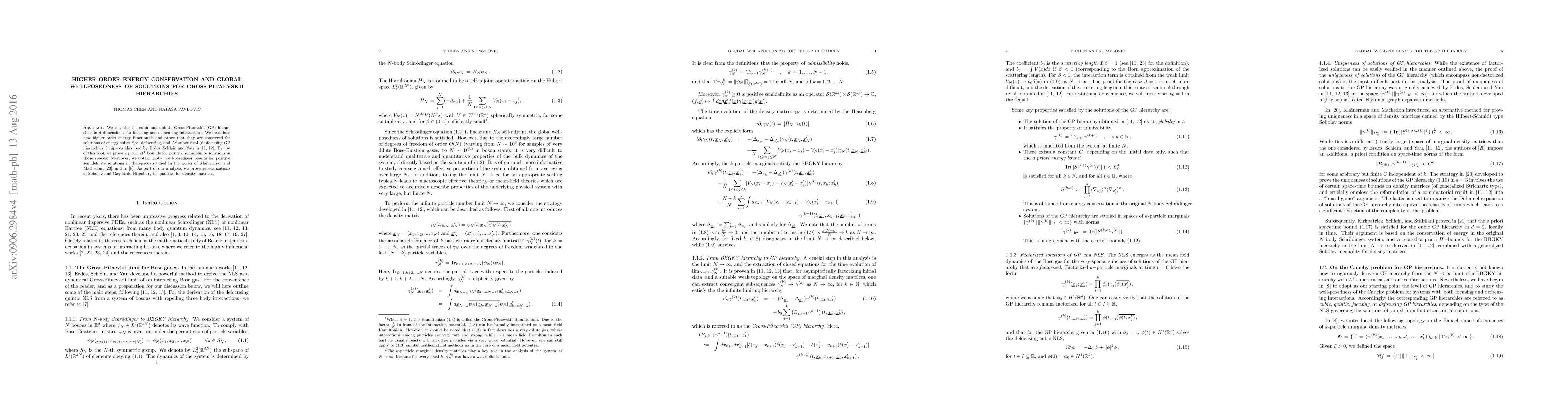 We consider the cubic and quintic Gross-Pitaevskii (GP) hierarchies in $d$ dimensions, for focusing and defocusing interactions. We introduce new higher order energy functionals and prove that they are conserved for solutions of energy subcritical defocusing, and $L^2$ subcritical (de)focusing GP hierarchies, in spaces also used by Erd\"os, Schlein and Yau in \cite{esy1,esy2}. By use of this tool, we prove a priori $H^1$ bounds for positive semidefinite solutions in those spaces. Moreover, we obtain global well-posedness results for positive semidefinite solutions in the spaces studied in the works of Klainerman and Machedon, \cite{klma}, and in \cite{chpa2}. As part of our analysis, we prove generalizations of Sobolev and Gagliardo-Nirenberg inequalities for density matrices.