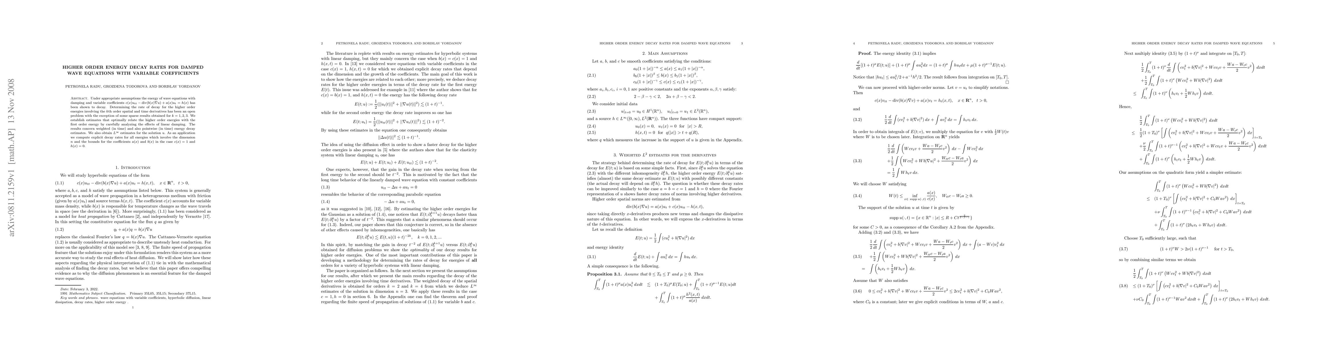 Under appropriate assumptions the energy of wave equations with damping and variable coefficients $c(x)u_{tt}-\hbox{div}(b(x)\nabla u)+a(x)u_t =h(x)$ has been shown to decay. Determining the rate of decay for the higher order energies involving the $k$th order spatial and time derivatives has been an open problem with the exception of some sparse results obtained for $k=1,2,3$. We establish estimates that optimally relate the higher order energies with the first order energy by carefully analyzing the effects of linear damping. The results concern weighted (in time) and also pointwise (in time) energy decay estimates. We also obtain $L^\infty$ estimates for the solution $u$. As an application we compute explicit decay rates for all energies which involve the dimension $n$ and the bounds for the coefficients $a(x)$ and $b(x)$ in the case $c (x)=1$ and $h(x)=0.$