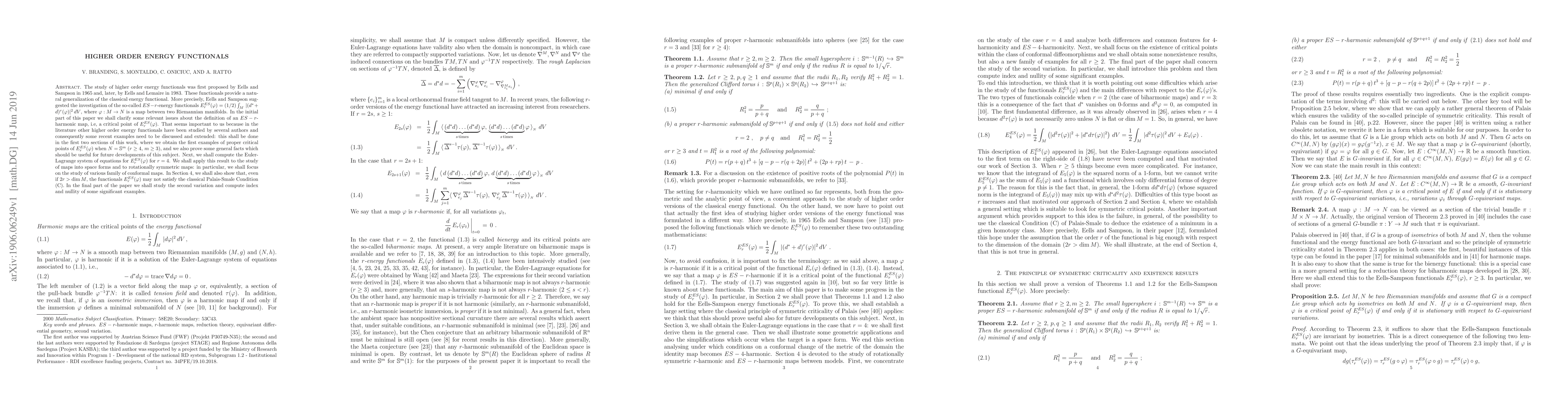 This paper investigates higher order energy functionals, specifically the $ES-r$-energy functionals, and explores their critical points, known as $ES-r$-harmonic maps. It provides examples and proves general facts about these functionals, computes the Euler-Lagrange equations for $r=4$, and examines their applications to conformal maps and the failure of the Palais-Smale condition in certain dimensions.