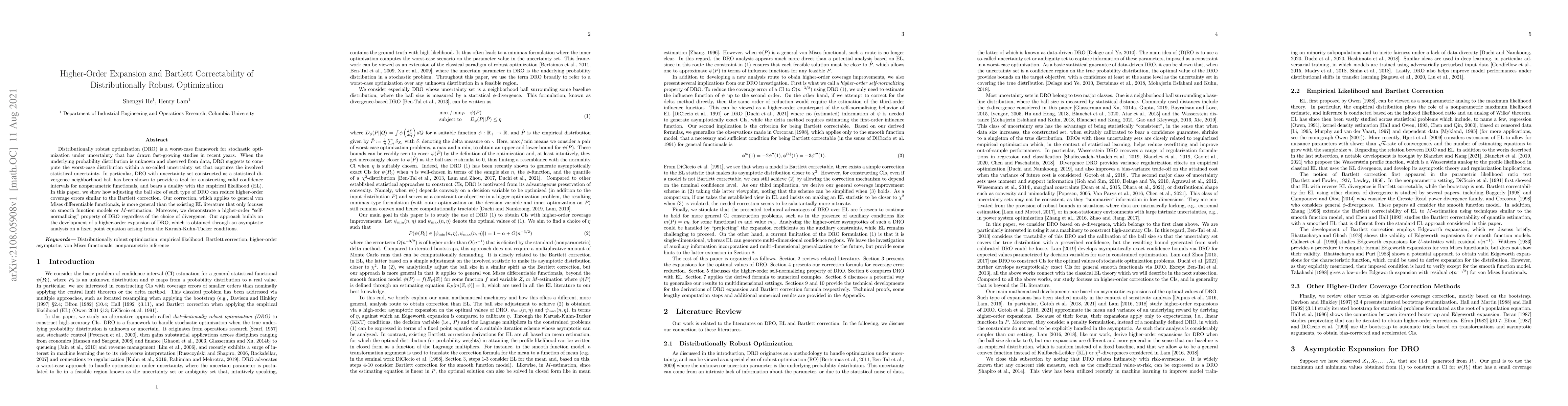 Distributionally robust optimization (DRO) is a worst-case framework for stochastic optimization under uncertainty that has drawn fast-growing studies in recent years. When the underlying probability distribution is unknown and observed from data, DRO suggests to compute the worst-case distribution within a so-called uncertainty set that captures the involved statistical uncertainty. In particular, DRO with uncertainty set constructed as a statistical divergence neighborhood ball has been shown to provide a tool for constructing valid confidence intervals for nonparametric functionals, and bears a duality with the empirical likelihood (EL). In this paper, we show how adjusting the ball size of such type of DRO can reduce higher-order coverage errors similar to the Bartlett correction. Our correction, which applies to general von Mises differentiable functionals, is more general than the existing EL literature that only focuses on smooth function models or $M$-estimation. Moreover, we demonstrate a higher-order "self-normalizing" property of DRO regardless of the choice of divergence. Our approach builds on the development of a higher-order expansion of DRO, which is obtained through an asymptotic analysis on a fixed point equation arising from the Karush-Kuhn-Tucker conditions.