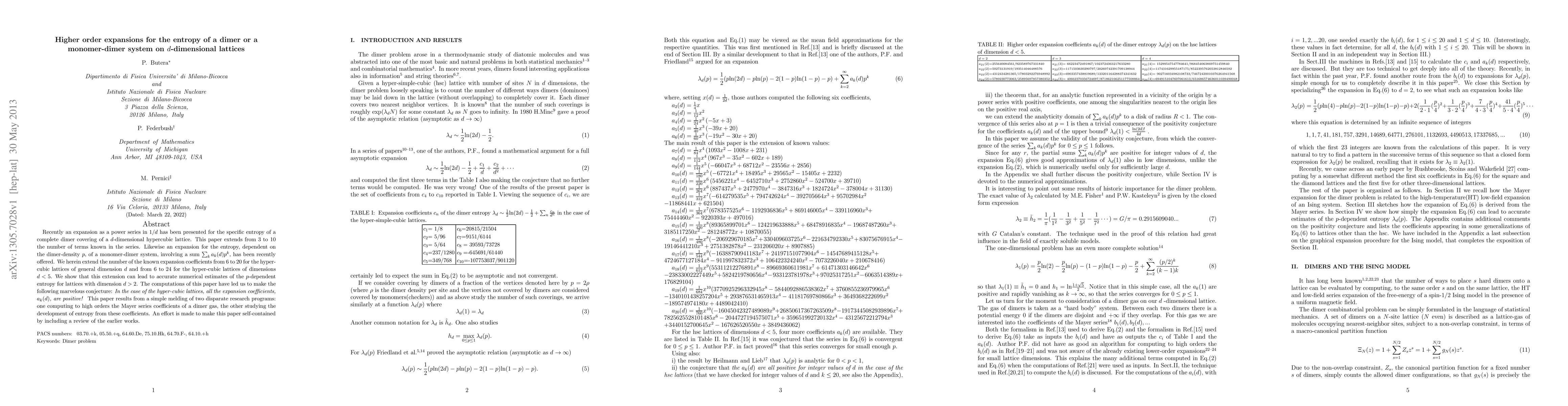 Recently an expansion as a power series in 1/d has been presented for the specific entropy of a complete dimer covering of a d-dimensional hypercubic lattice. This paper extends from 3 to 10 the number of terms known in the series. Likewise an expansion for the entropy, dependent on the dimer-density p, of a monomer-dimer system, involving a sum sum_k a_k(d) p^k, has been recently offered. We herein extend the number of the known expansion coefficients from 6 to 20 for the hyper-cubic lattices of general dimension d and from 6 to 24 for the hyper-cubic lattices of dimensions d < 5 . We show that this extension can lead to accurate numerical estimates of the p-dependent entropy for lattices with dimension d > 2. The computations of this paper have led us to make the following marvelous conjecture: "In the case of the hyper-cubic lattices, all the expansion coefficients, a_k(d), are positive"! This paper results from a simple melding of two disparate research programs: one computing to high orders the Mayer series coefficients of a dimer gas, the other studying the development of entropy from these coefficients. An effort is made to make this paper self-contained by including a review of the earlier works.
