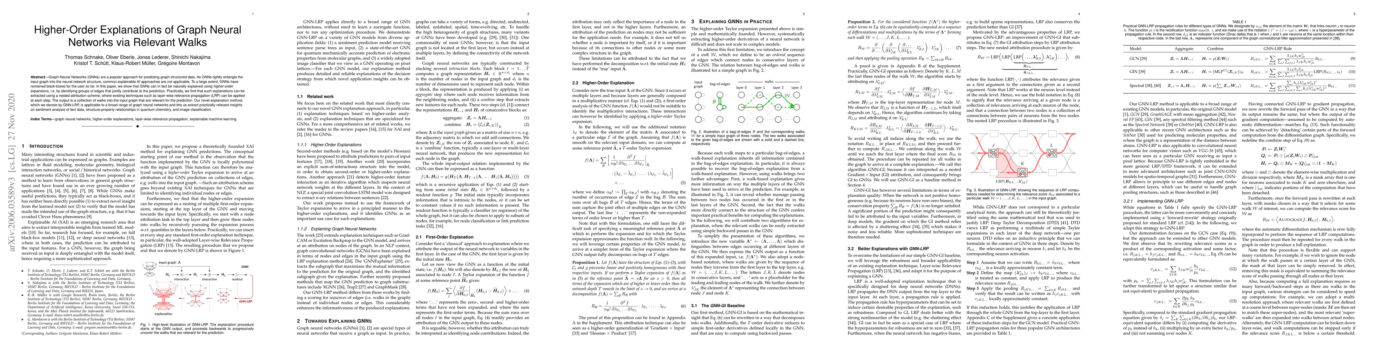 This paper proposes a novel method called GNN-LRP to explain Graph Neural Networks (GNNs) by identifying relevant walks in the input graph that contribute to the prediction. This higher-order explanation method leverages layer-wise relevance propagation and is applicable to various GNN tasks, including sentiment analysis, quantum chemistry, and image classification.
