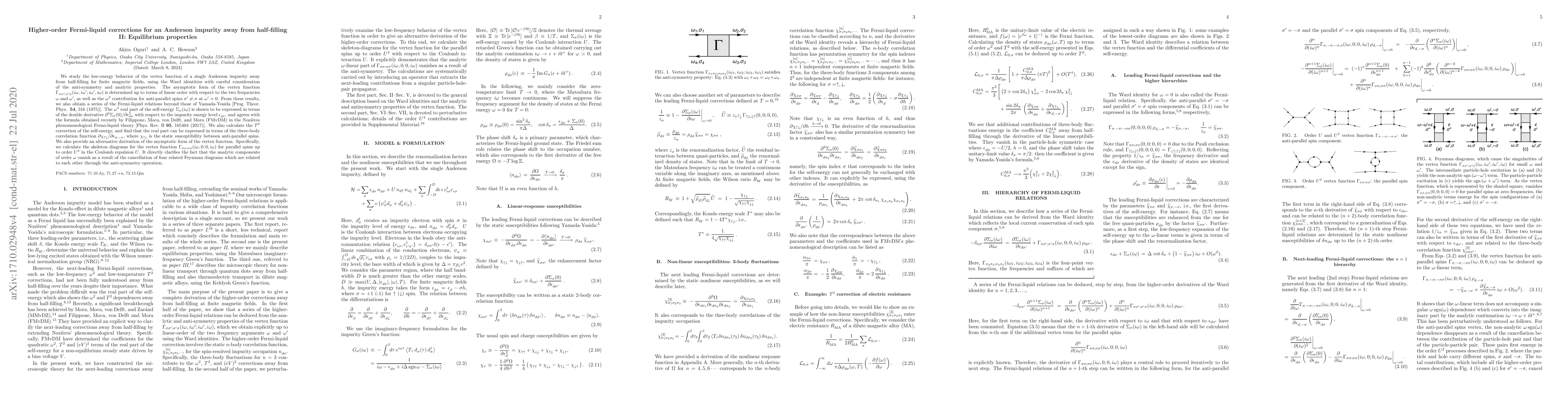 This paper investigates the low-energy vertex function behavior of an Anderson impurity model, focusing on equilibrium properties away from half-filling under finite magnetic fields. The study determines the asymptotic form of the vertex function up to linear frequency terms and $\omega^2$ contributions, deriving higher-order Fermi-liquid corrections and alternative expressions for the self-energy and $T^2$ corrections.