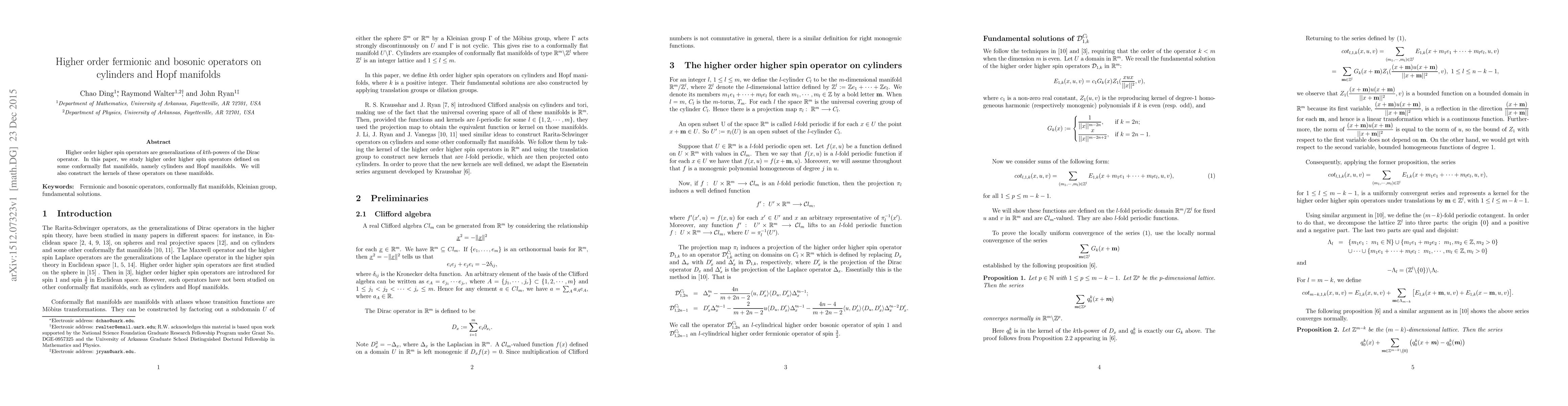 Researchers studied higher order fermionic and bosonic operators on cylinders and Hopf manifolds, focusing on their kernels and implications for conformally flat manifolds.