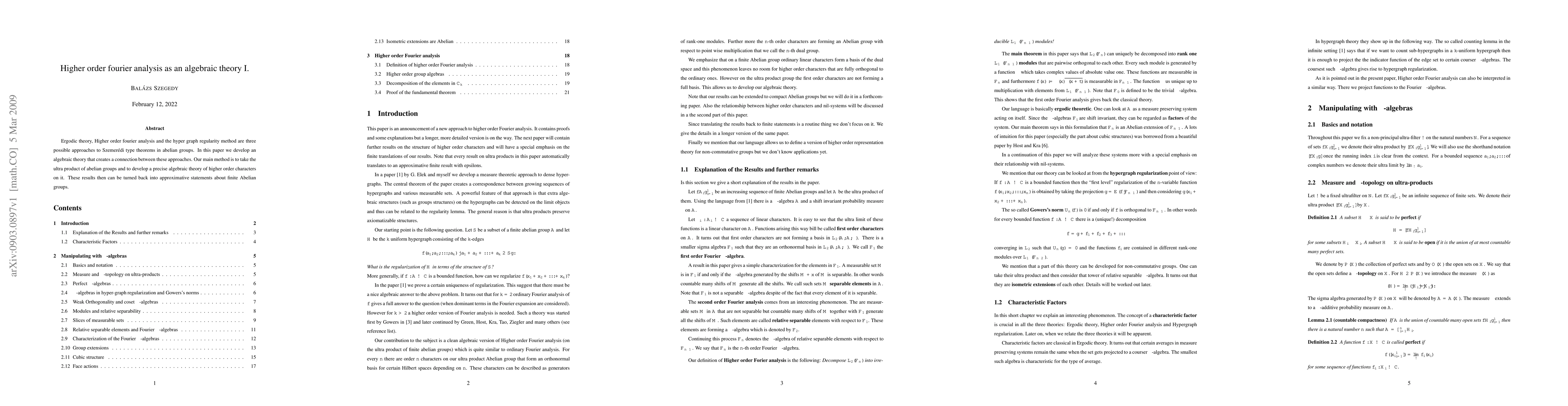 This paper develops an algebraic theory linking higher order Fourier analysis, ergodic theory, and the hypergraph regularity method to Szemerédi type theorems in abelian groups, using ultra products and higher order characters for finite Abelian groups.
