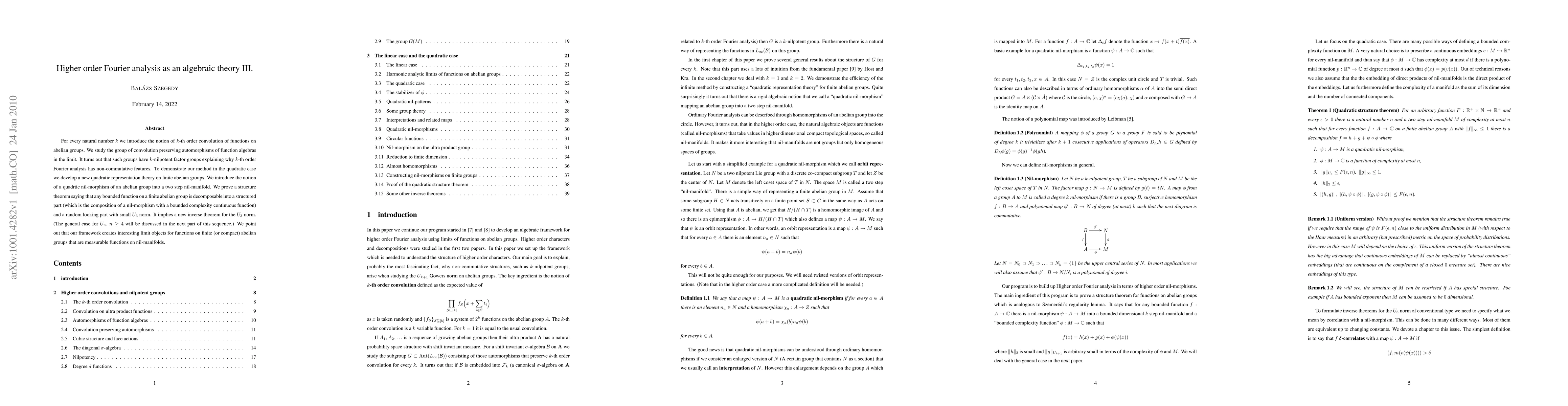 For every natural number k we introduce the notion of k-th order convolution of functions on abelian groups. We study the group of convolution preserving automorphisms of function algebras in the limit. It turns out that such groups have k-nilpotent factor groups explaining why k-th order Fourier analysis has non-commutative features. To demonstrate our method in the quadratic case we develop a new quadratic representation theory on finite abelian groups. We introduce the notion of a quadrtic nil-morphism of an abelian group into a two step nil-manifold. We prove a structure theorem saying that any bounded function on a finite abelian group is decomposable into a structured part (which is the composition of a nil-morphism with a bounded complexity continuous function) and a random looking part with small U3 norm. It implies a new inverse theorem for the U3 norm. (The general case for Un, n>3 will be discussed in the next part of this sequence.) We point out that our framework creates interesting limit objects for functions on finite (or compact) abelian groups that are measurable functions on nil-manifolds.