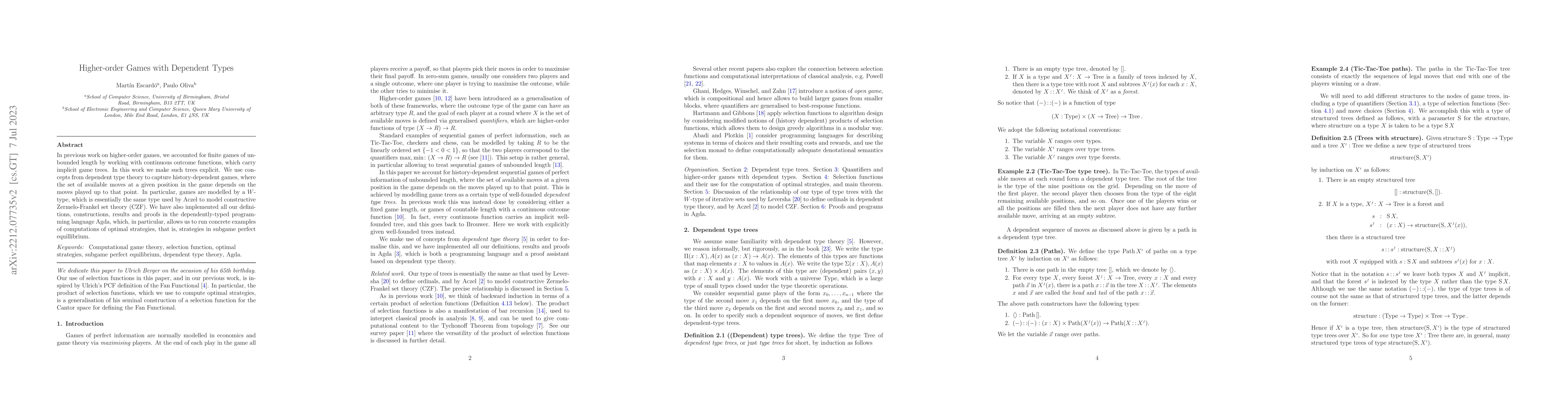 This paper introduces higher-order games with explicit game trees using dependent type theory to model history-dependent moves. It employs a W-type to represent these games and has implemented the concepts in Agda to compute optimal strategies in subgame perfect equilibrium.