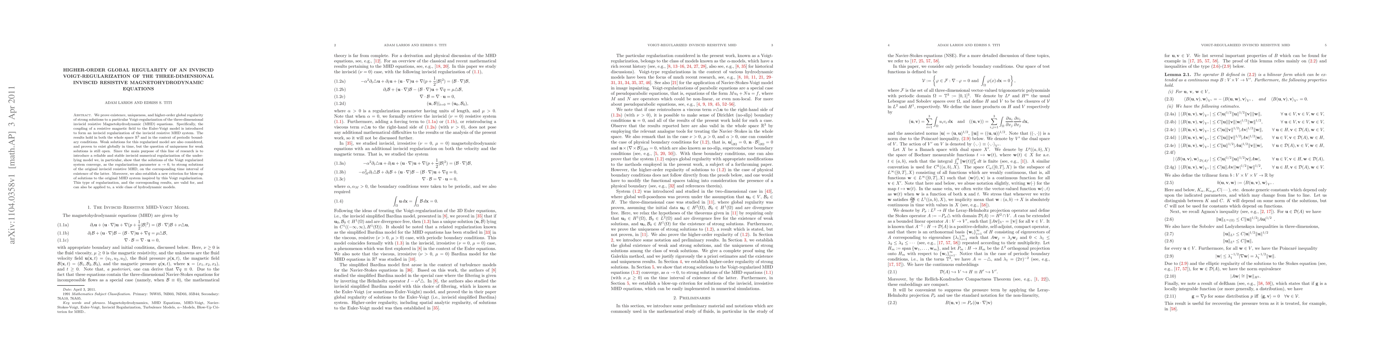 We prove existence, uniqueness, and higher-order global regularity of strong solutions to a particular Voigt-regularization of the three-dimensional inviscid resistive Magnetohydrodynamic (MHD) equations. Specifically, the coupling of a resistive magnetic field to the Euler-Voigt model is introduced to form an inviscid regularization of the inviscid resistive MHD system. The results hold in both the whole space $\nR^3$ and in the context of periodic boundary conditions. Weak solutions for this regularized model are also considered, and proven to exist globally in time, but the question of uniqueness for weak solutions is still open. Since the main purpose of this line of research is to introduce a reliable and stable inviscid numerical regularization of the underlying model we, in particular, show that the solutions of the Voigt regularized system converge, as the regularization parameter $\alpha\maps0$, to strong solutions of the original inviscid resistive MHD, on the corresponding time interval of existence of the latter. Moreover, we also establish a new criterion for blow-up of solutions to the original MHD system inspired by this Voigt regularization. This type of regularization, and the corresponding results, are valid for, and can also be applied to, a wide class of hydrodynamic models.