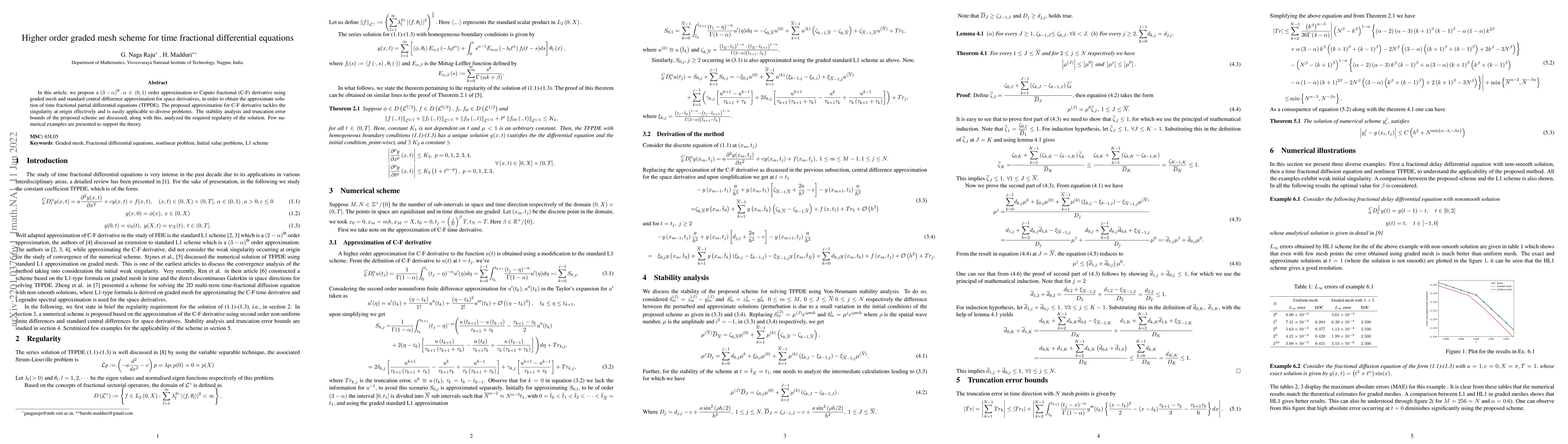 This paper proposes a higher order graded mesh scheme for solving time fractional partial differential equations using a Caputo fractional derivative approximation. The method effectively handles the singularity at the origin and is demonstrated through stability analysis, error bounds, and numerical examples.
