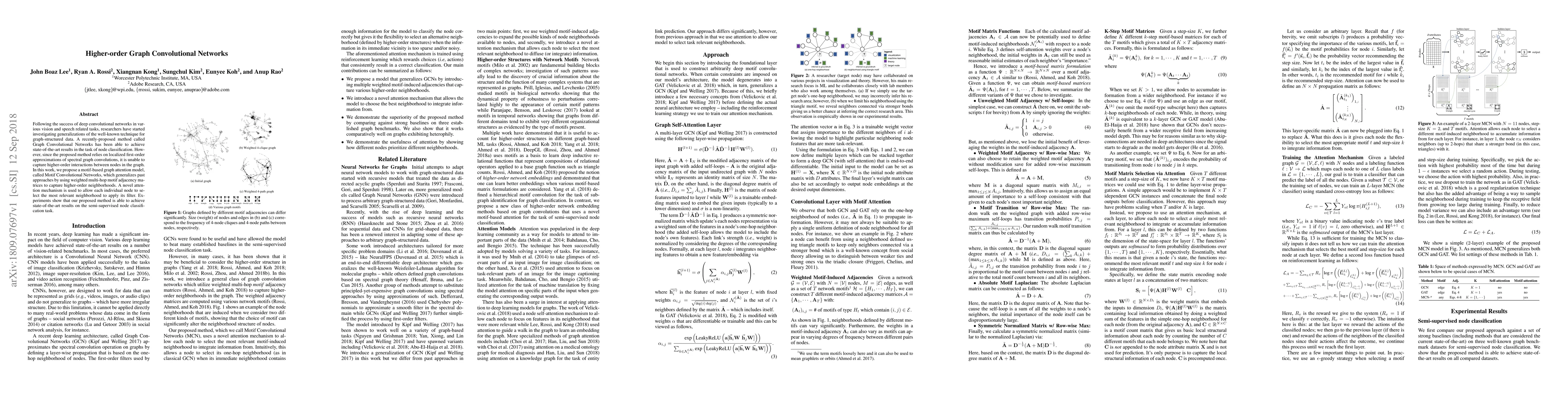 This paper proposes Motif Convolutional Networks (MCNs), a higher-order graph convolutional network that uses motif adjacency matrices to capture multi-hop interactions, improving upon first-order approximations. The method employs an attention mechanism to focus on relevant neighborhoods, achieving state-of-the-art results in node classification tasks.