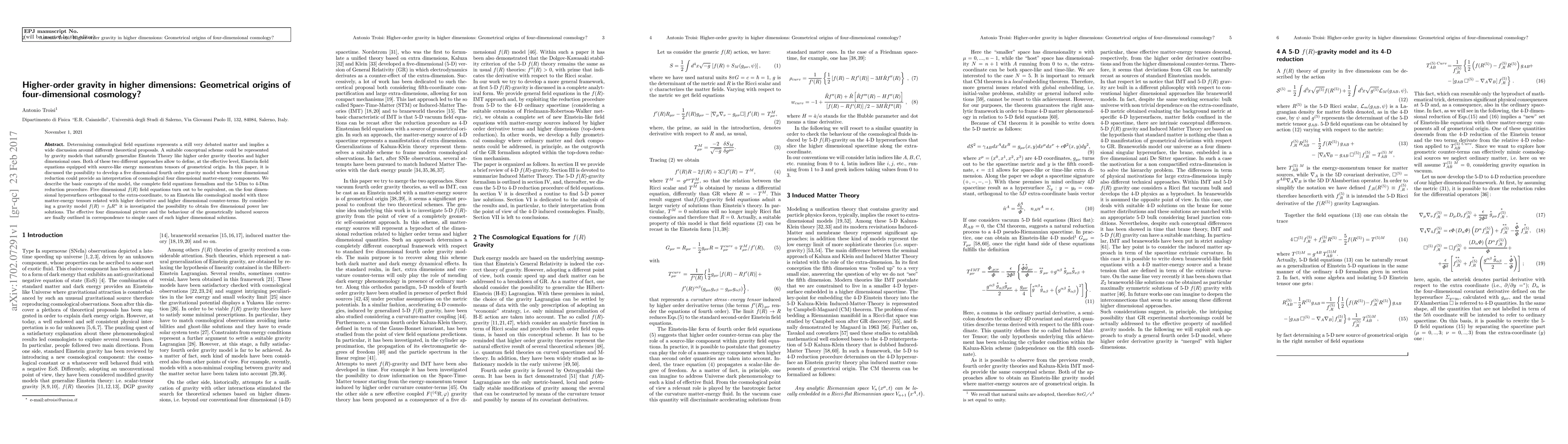 This paper explores the development of a five-dimensional fourth-order gravity model to interpret four-dimensional cosmological matter-energy components through a reduction procedure. It finds that five-dimensional $f(R)$ field equations yield an Einstein-like cosmological model in four dimensions with geometrically induced sources.