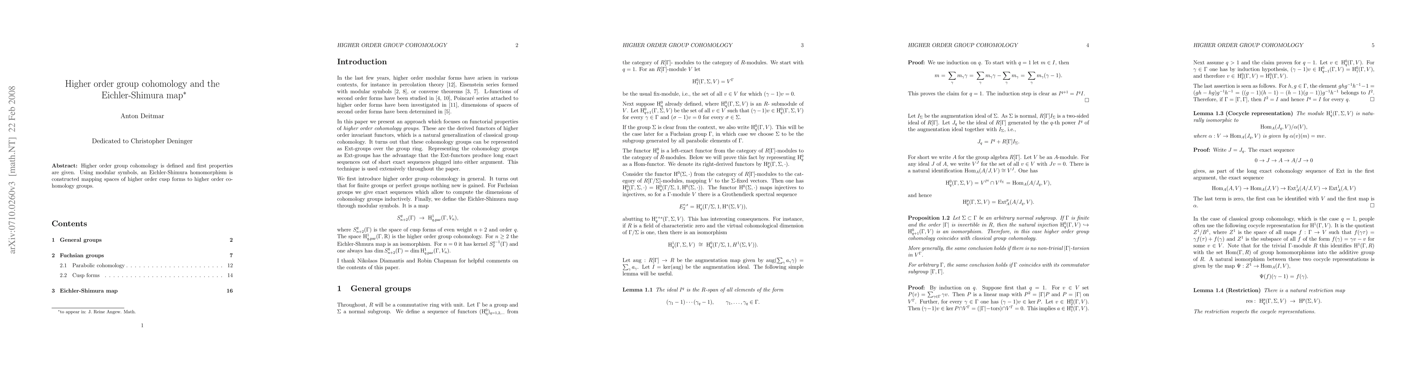 This paper defines higher order group cohomology and outlines its initial properties. It constructs an Eichler-Shimura homomorphism that maps spaces of higher order cusp forms to corresponding higher order cohomology groups using modular symbols.