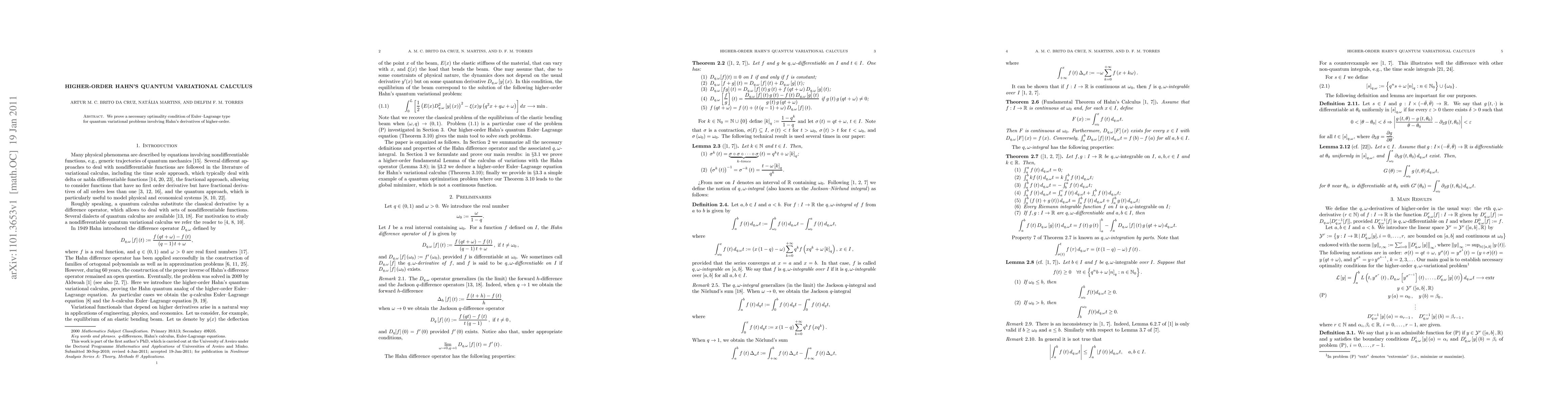 Summary: This paper establishes an Euler-Lagrange optimality condition for quantum variational problems utilizing higher-order Hahn's derivatives, providing a necessary criterion for solutions.