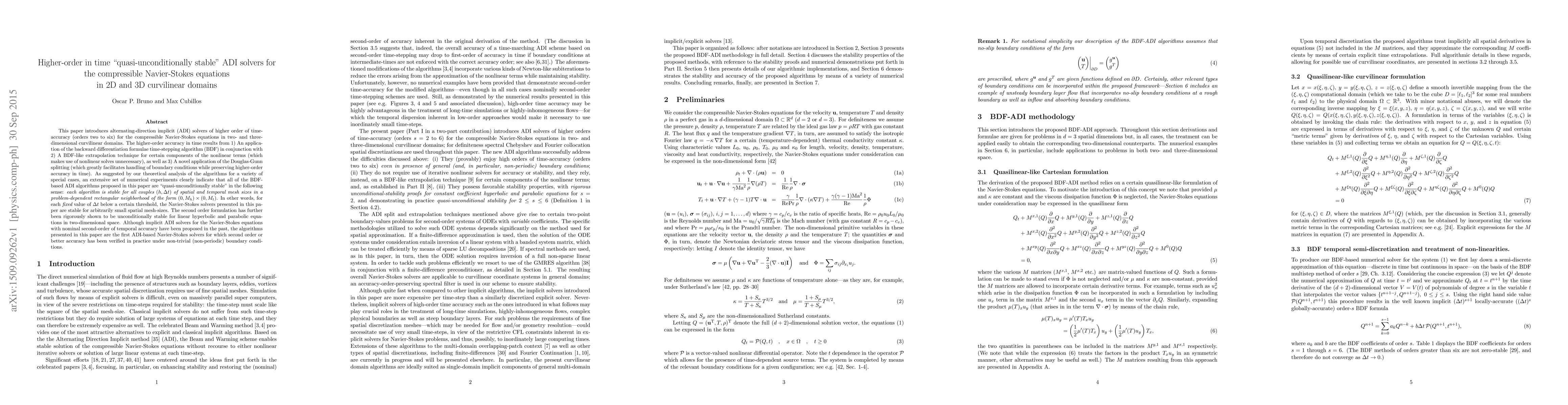 This paper introduces alternating-direction implicit (ADI) solvers of higher order of time-accuracy (orders two to six) for the compressible Navier-Stokes equations in two- and three-dimensional curvilinear domains. The higher-order accuracy in time results from 1) An application of the backward differentiation formulae time-stepping algorithm (BDF) in conjunction with 2) A BDF-like extrapolation technique for certain components of the nonlinear terms (which makes use of nonlinear solves unnecessary), as well as 3) A novel application of the Douglas-Gunn splitting (which greatly facilitates handling of boundary conditions while preserving higher-order accuracy in time). As suggested by our theoretical analysis of the algorithms for a variety of special cases, an extensive set of numerical experiments clearly indicate that all of the BDF-based ADI algorithms proposed in this paper are "quasi-unconditionally stable" in the following sense: each algorithm is stable for all couples $(h,\Delta t)$ of spatial and temporal mesh sizes in a problem-dependent rectangular neighborhood of the form $(0,M_h)\times (0,M_t)$. In other words, for each fixed value of $\Delta t$ below a certain threshold, the Navier-Stokes solvers presented in this paper are stable for arbitrarily small spatial mesh-sizes. The second order formulation has further been rigorously shown to be unconditionally stable for linear hyperbolic and parabolic equations in two-dimensional space. Although implicit ADI solvers for the Navier-Stokes equations with nominal second-order of temporal accuracy have been proposed in the past, the algorithms presented in this paper are the first ADI-based Navier-Stokes solvers for which second order or better accuracy has been verified in practice under non-trivial (non-periodic) boundary conditions.